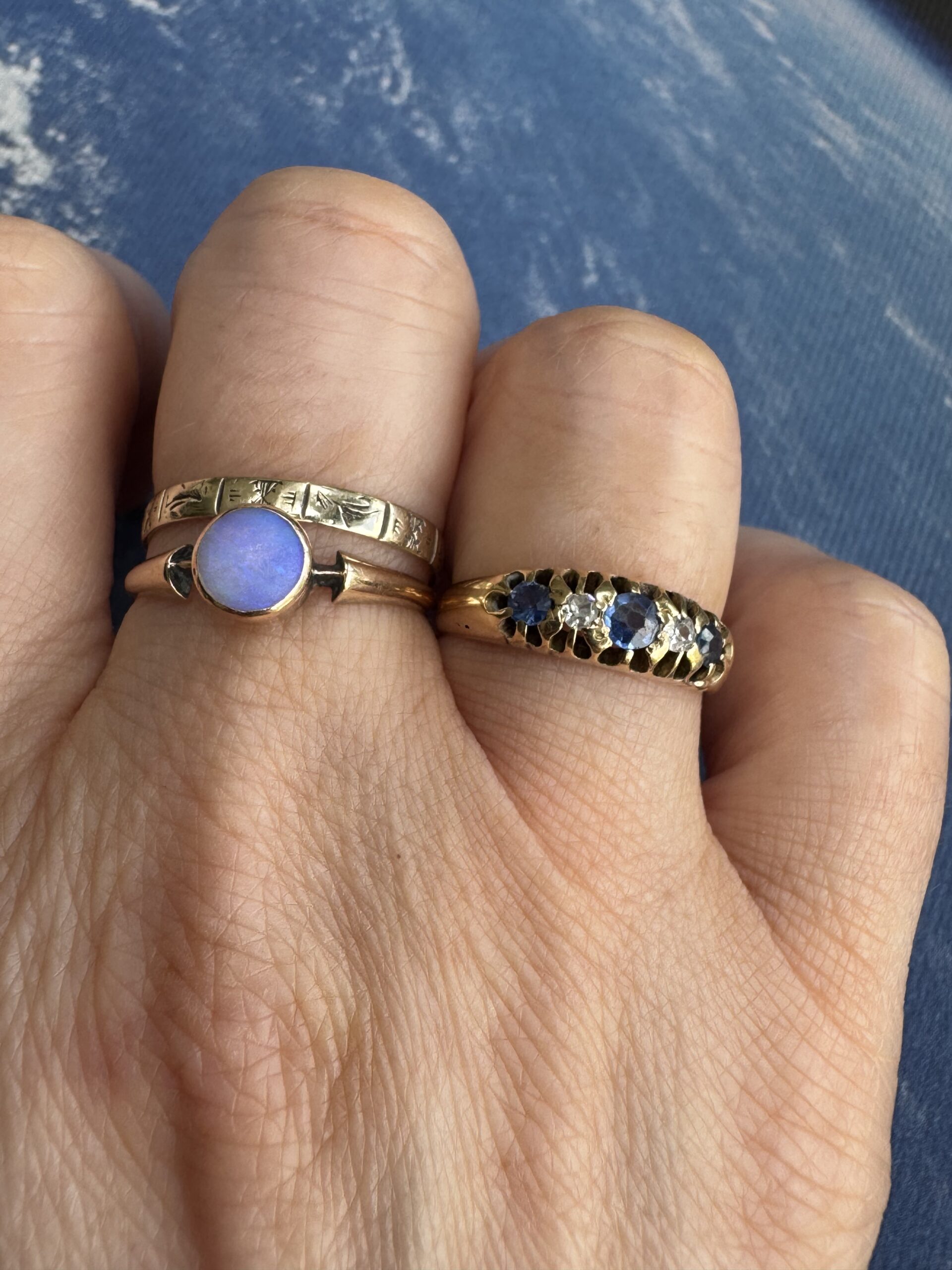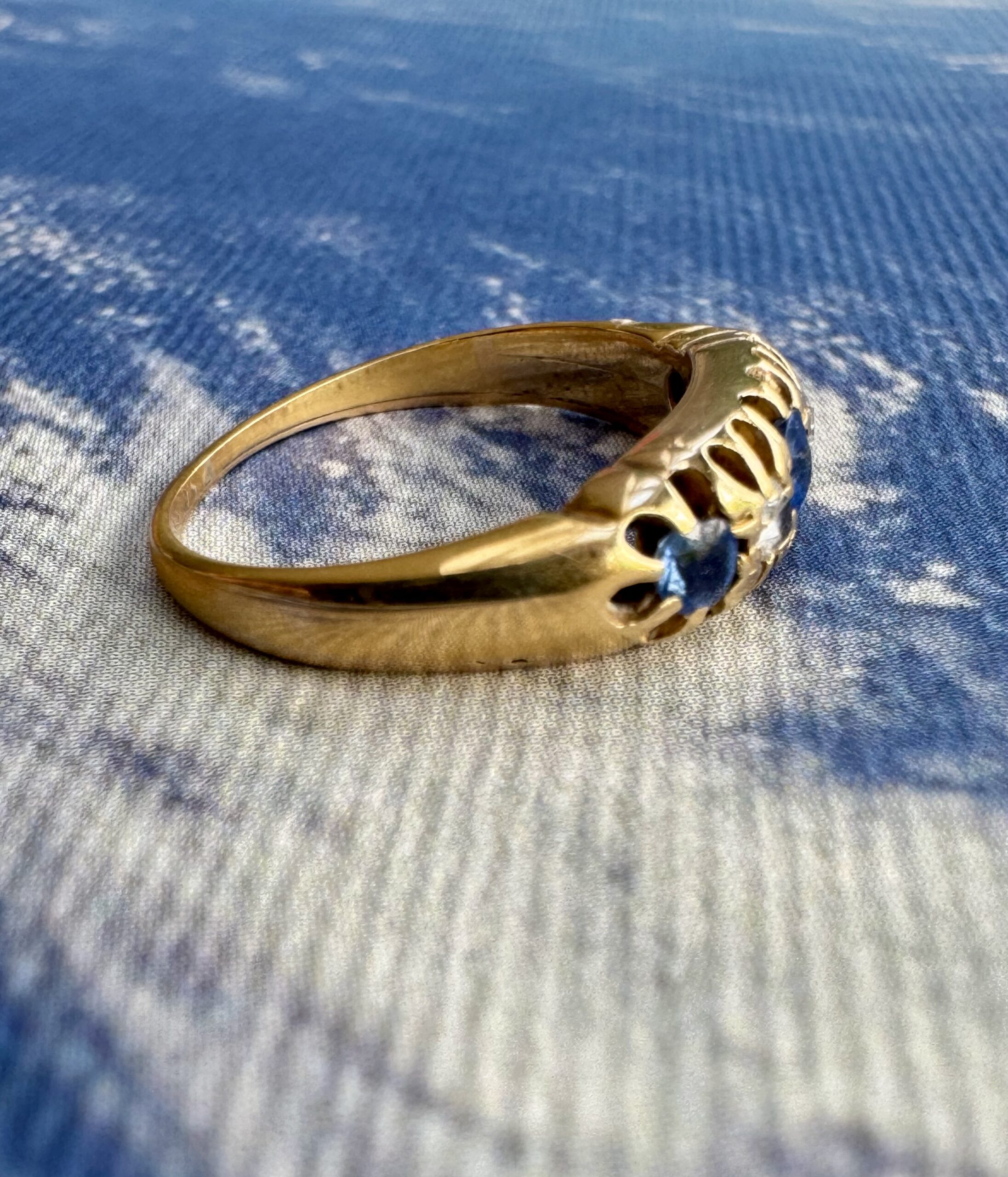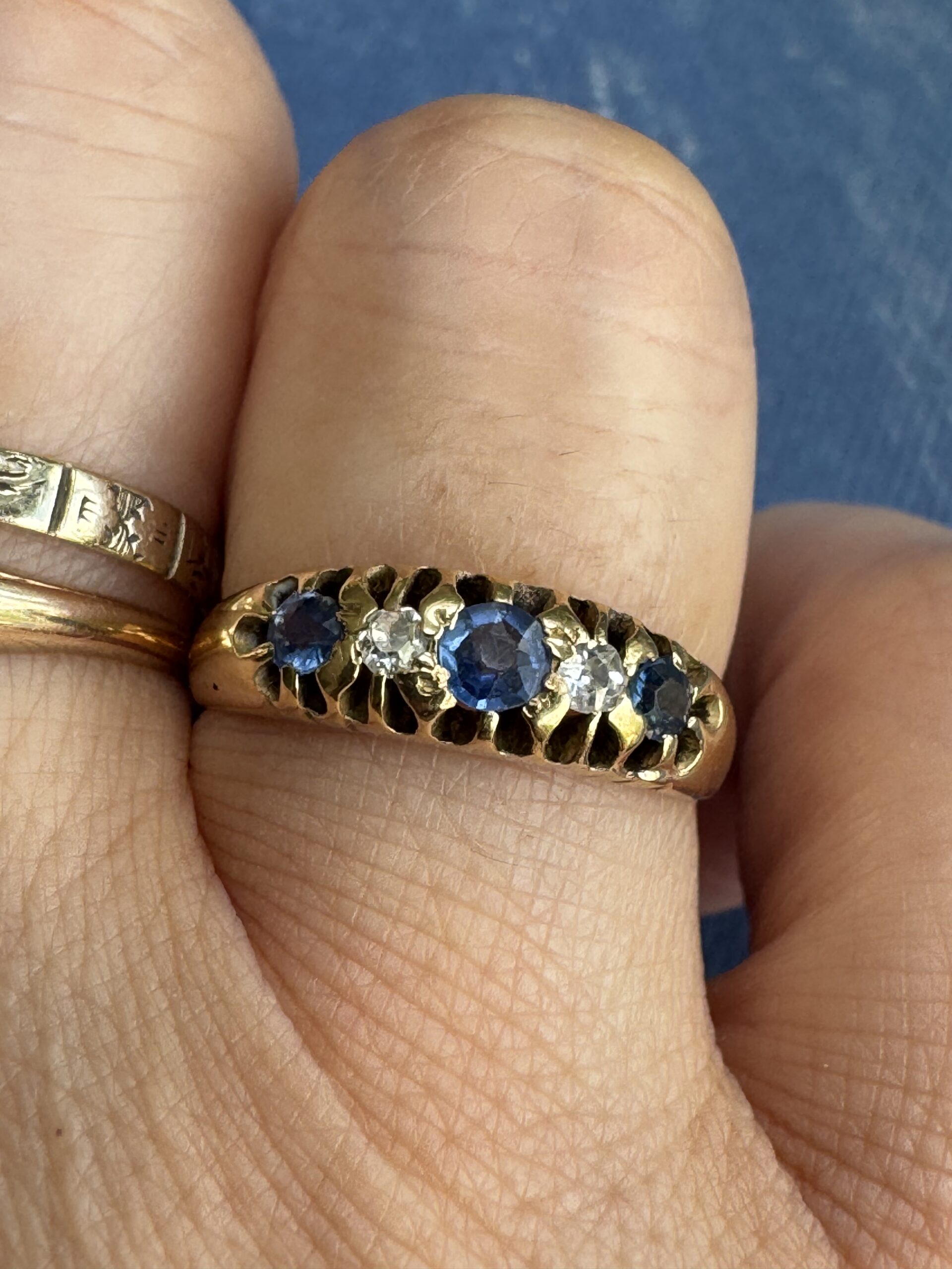 Sapphires measure: central 3mm, two flanking sapphires each 2.2mm – est tcw 0.3ct
