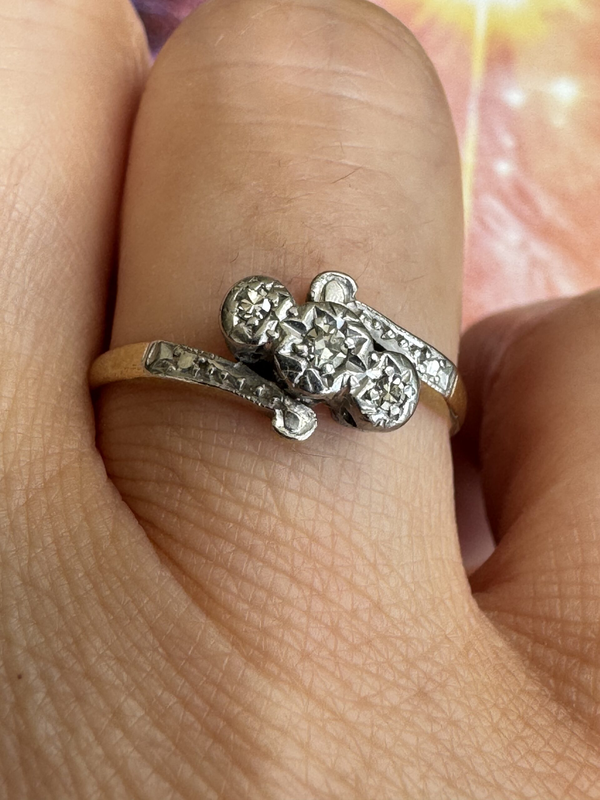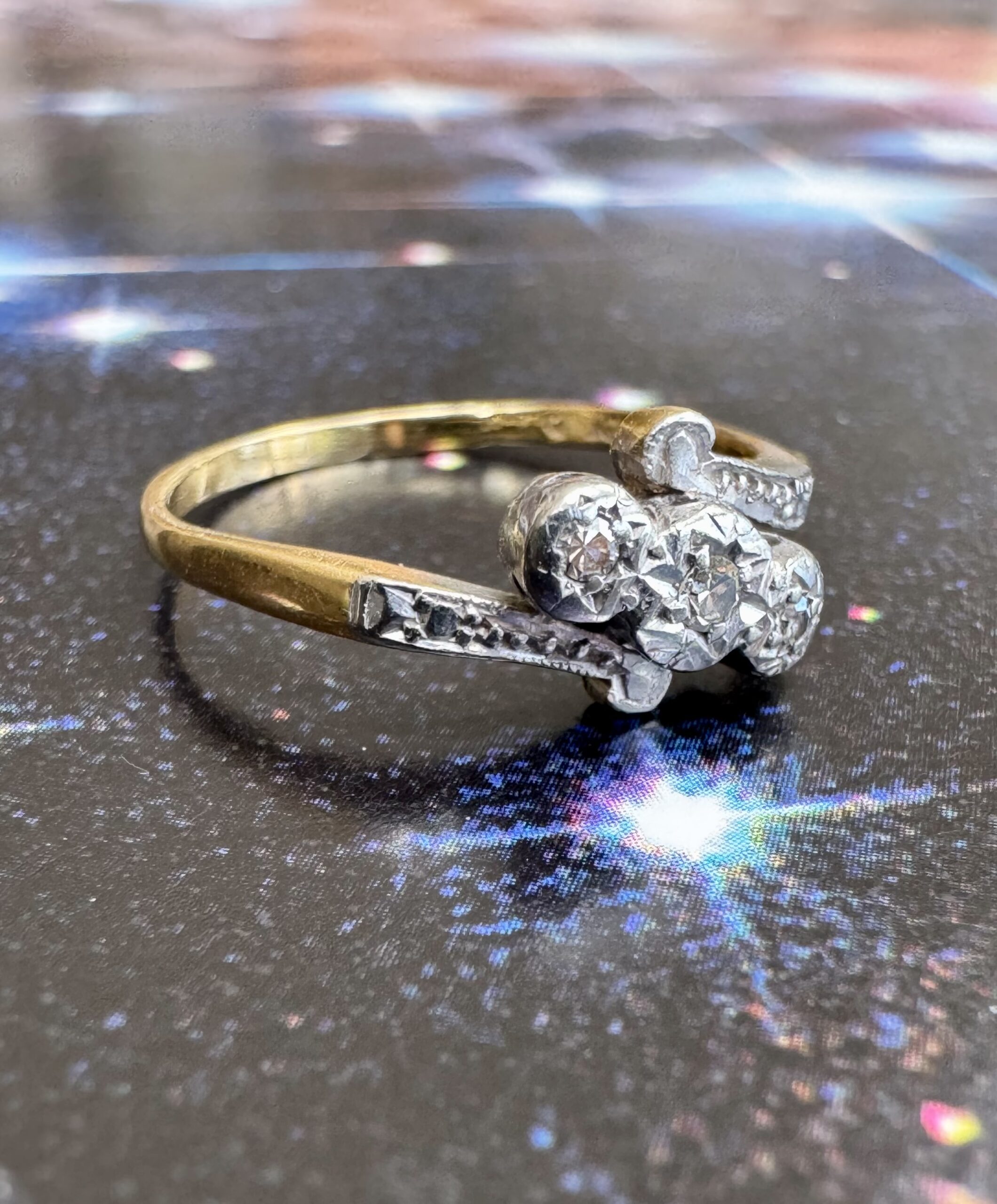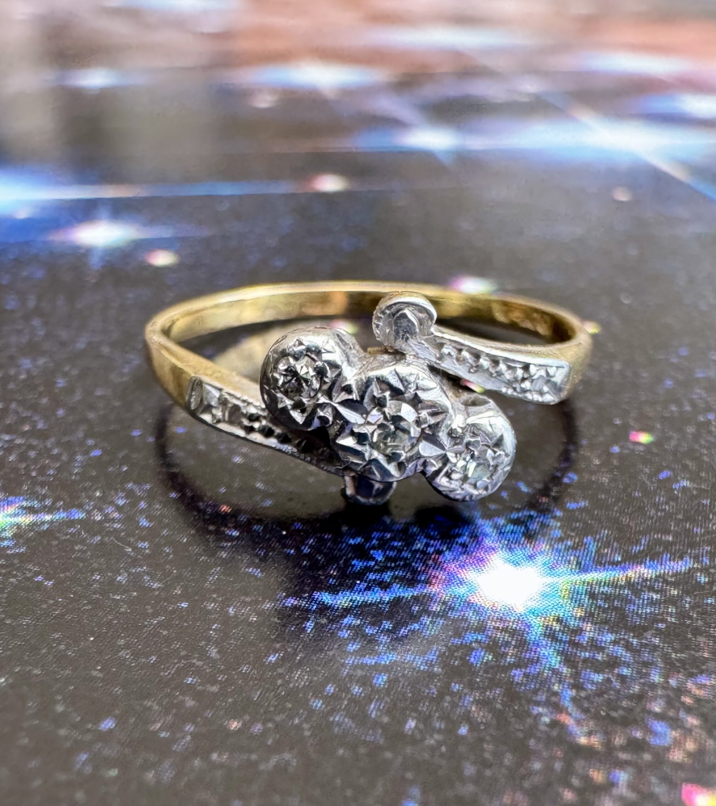 Beautiful Edwardian 18ct gold diamond trilogy twist ring, the three diamonds set in a platinum illusion setting. Hallmarked.
