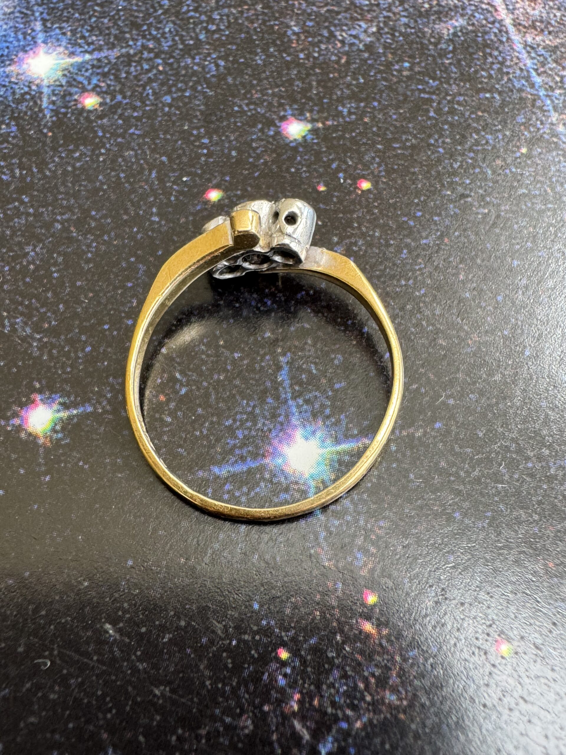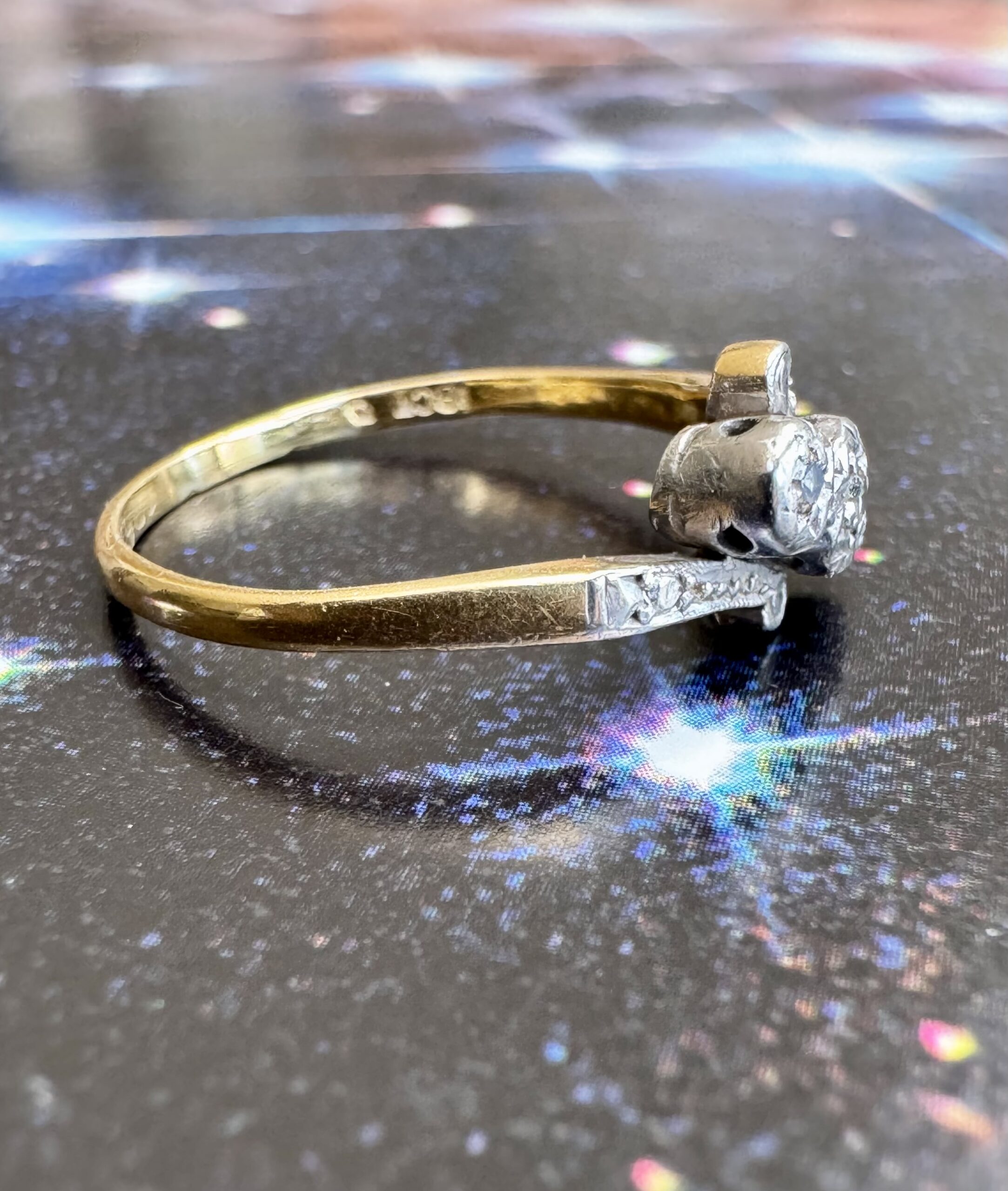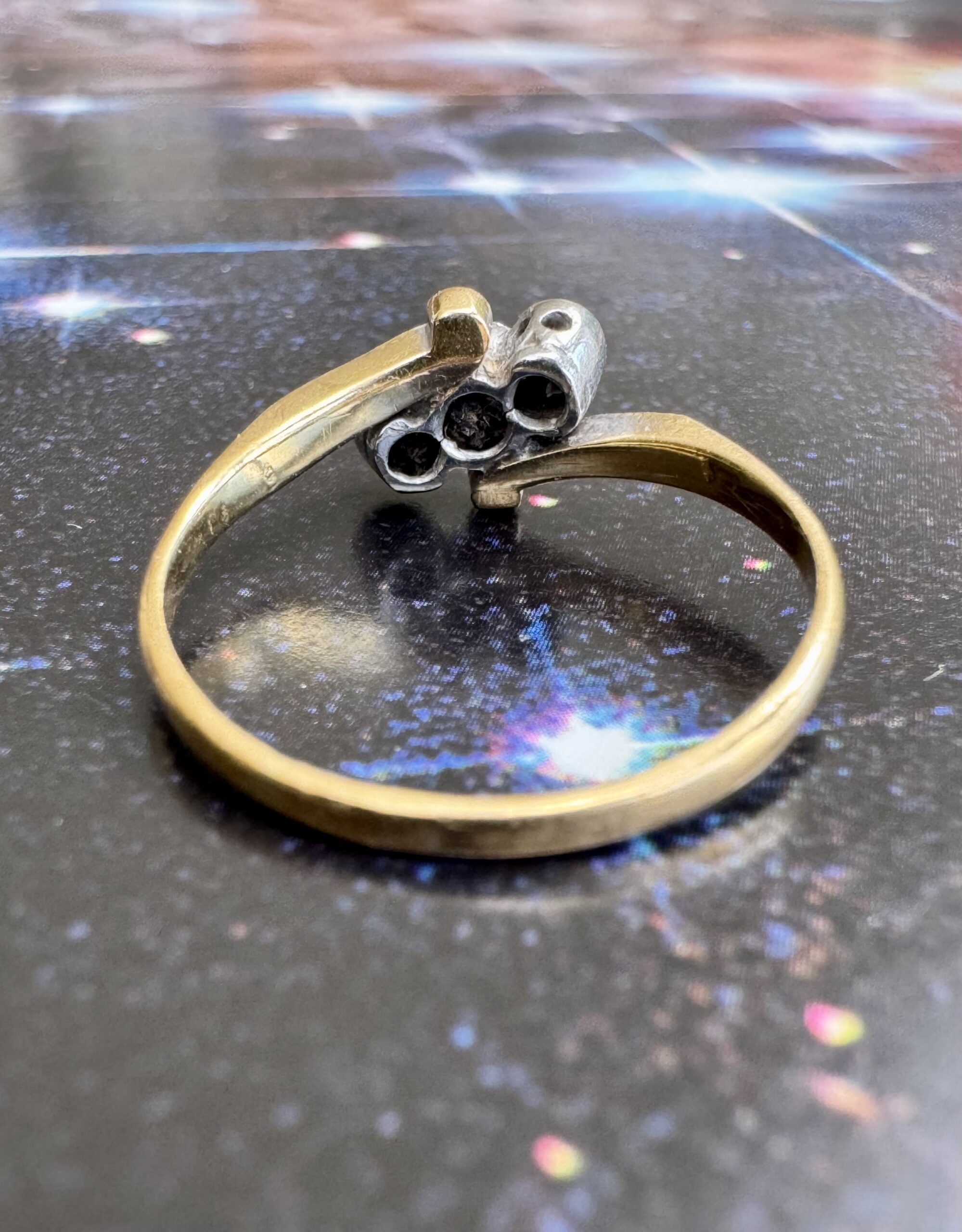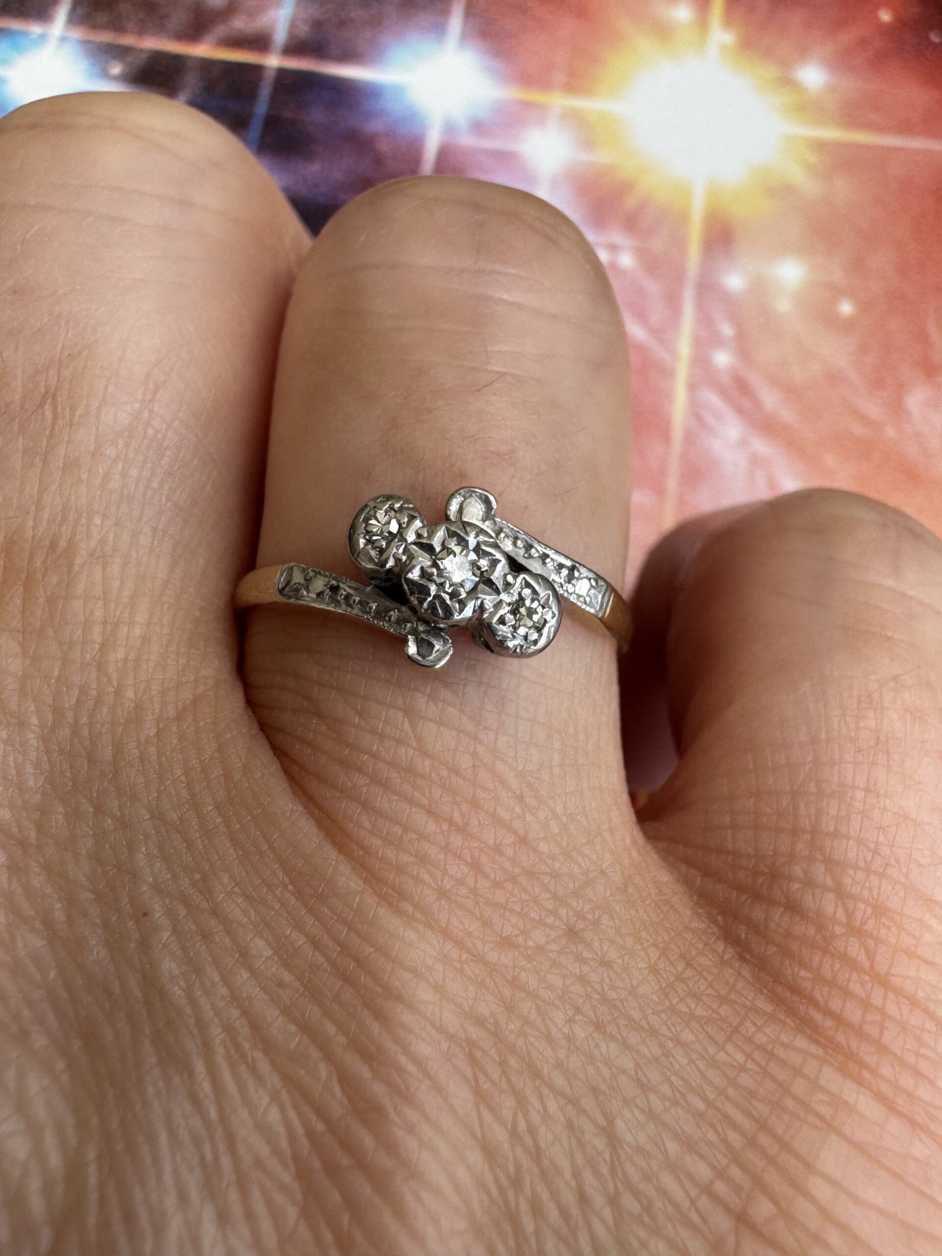 Beautiful Edwardian 18ct gold diamond trilogy twist ring, the three diamonds set in a platinum illusion setting. Hallmarked.