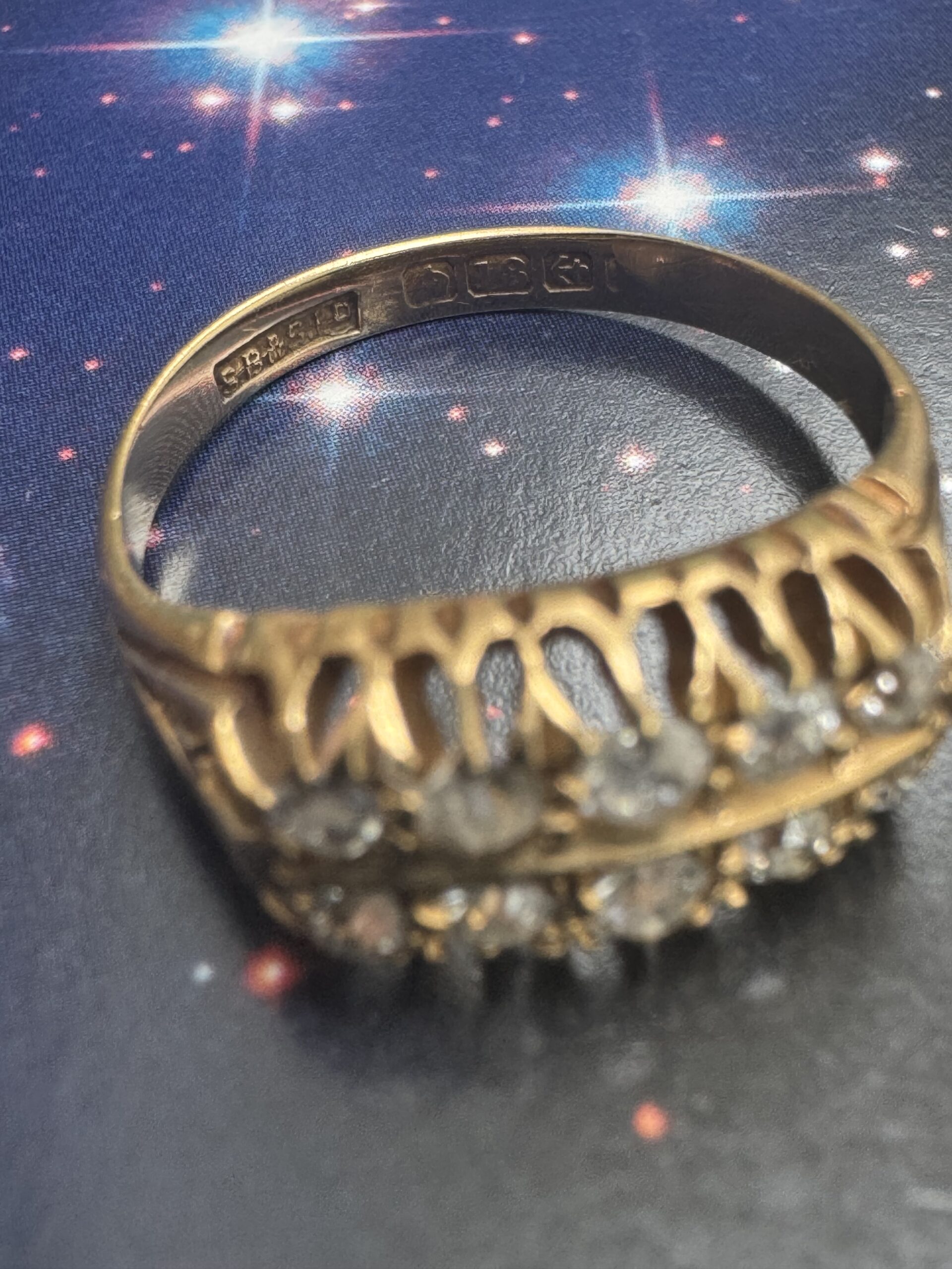 Full hallmarks for 18ct gold, assayed in Birmingham with makers mark for S. Blanckensee and Son Ltd. Date letter partially obscured, but this ring would be late Victorian or early Edwardian.