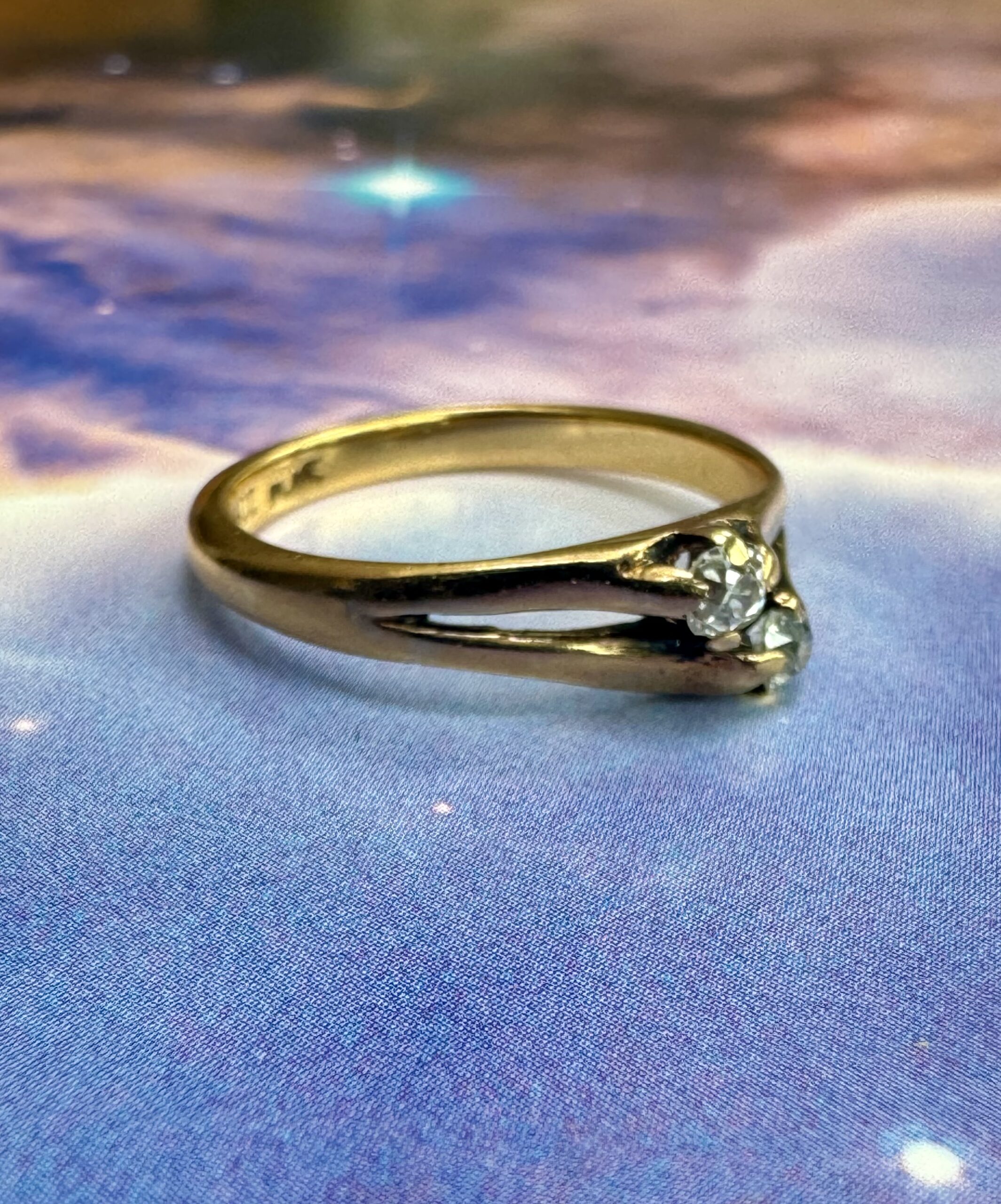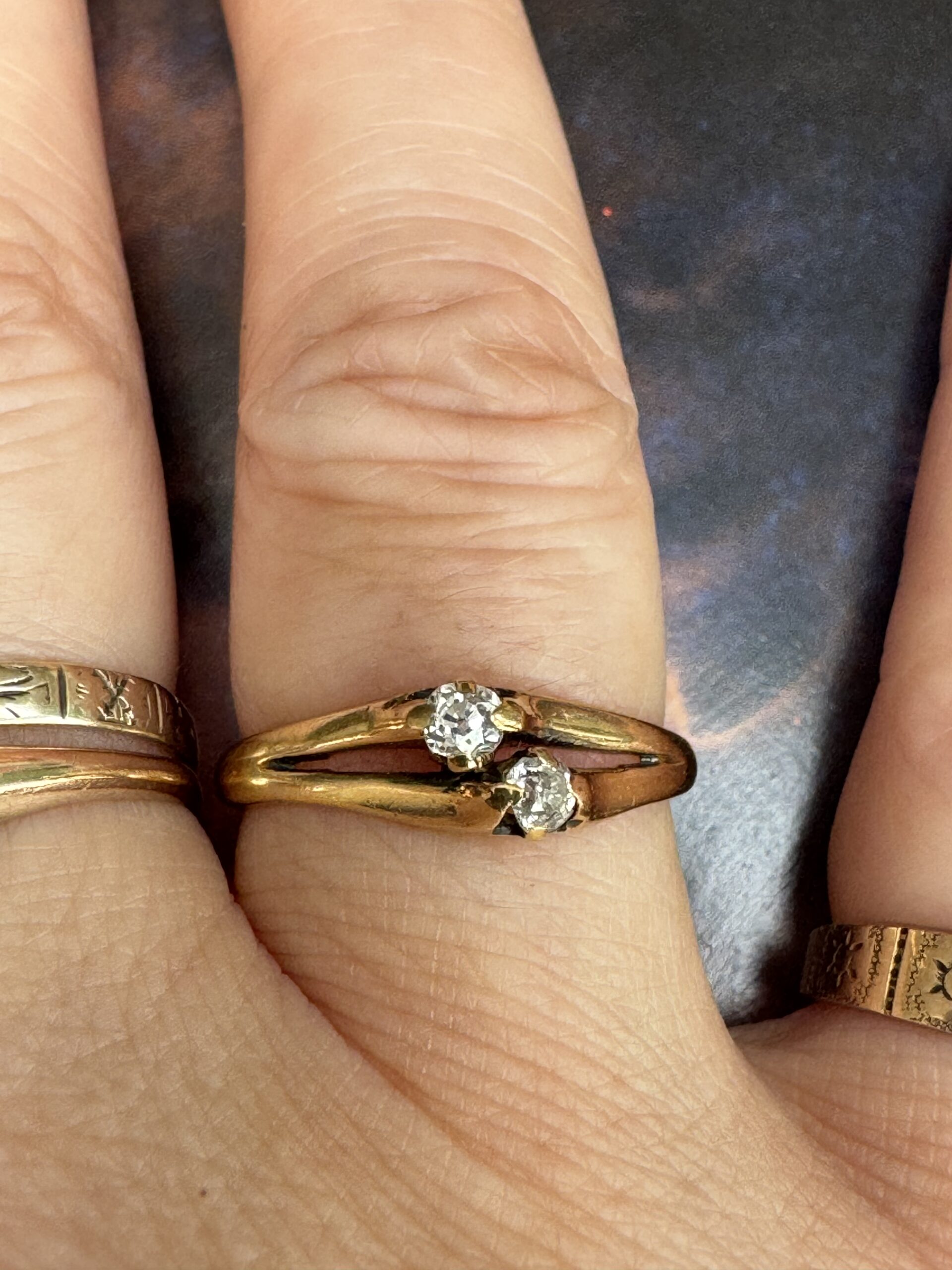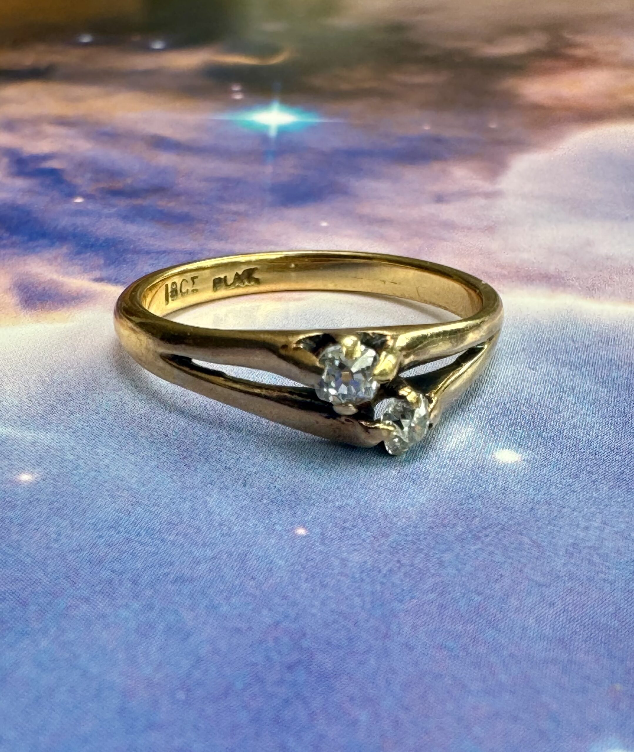 A wonderfully unique antique (early 20th Century) Toi et Moi ring with old cut diamonds, crafted in 18ct gold. The old cut diamonds are bright and sparkly and come to an est 0.15 ctw.