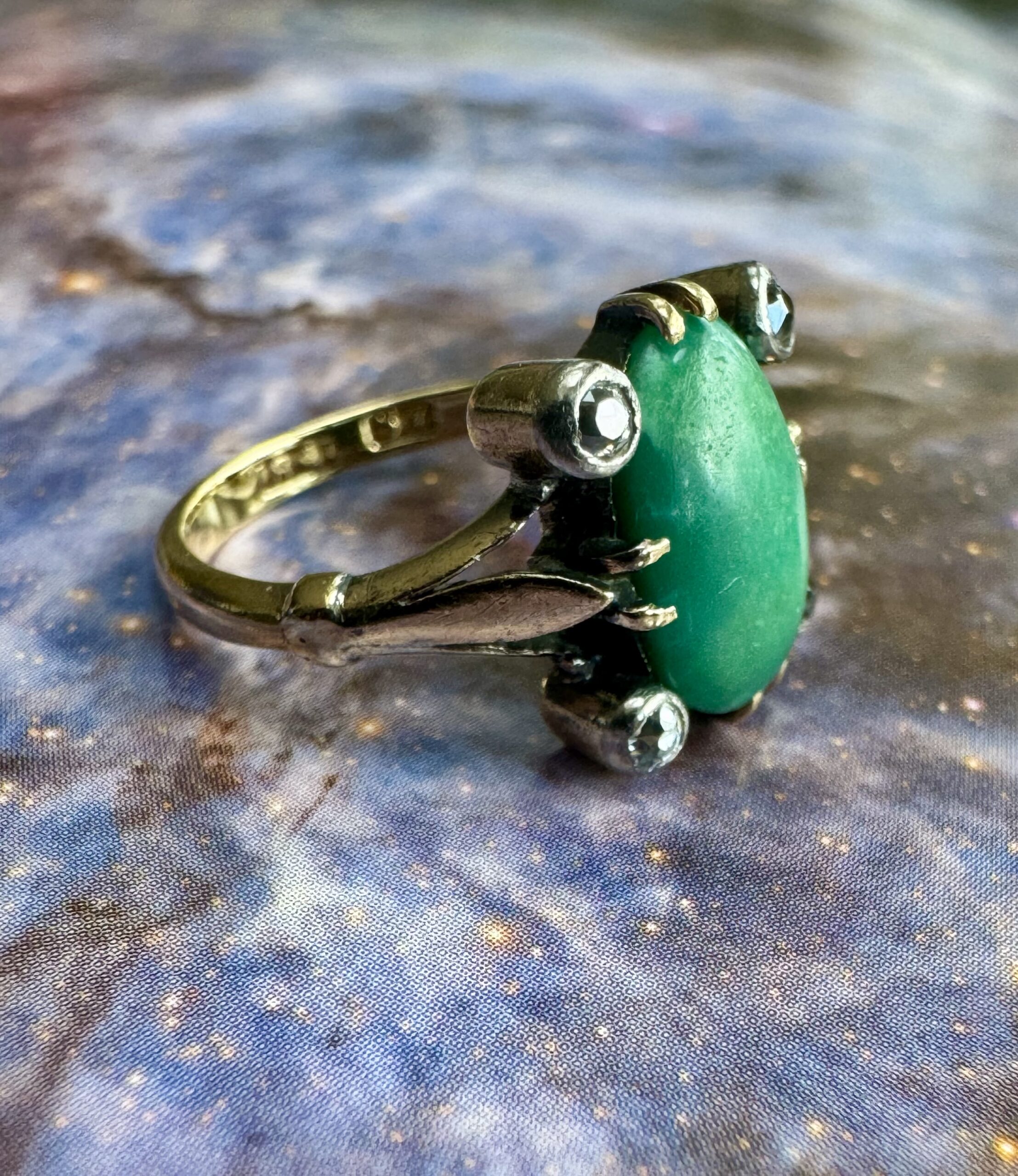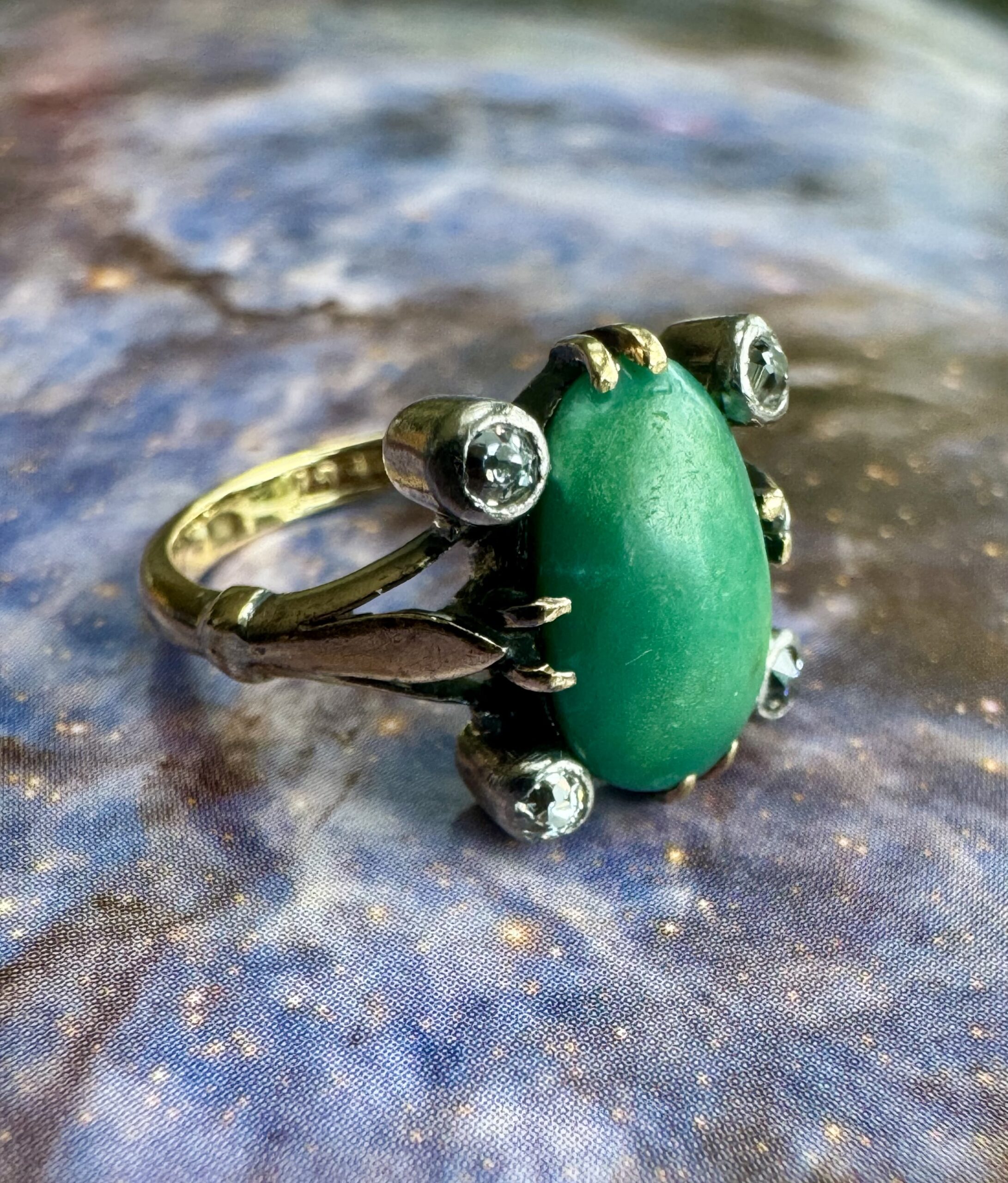 Absolutely stunning antique turquoise and diamond ring in an unusual and interesting design. Hallmarked 18ct gold. Makers mark for SZ