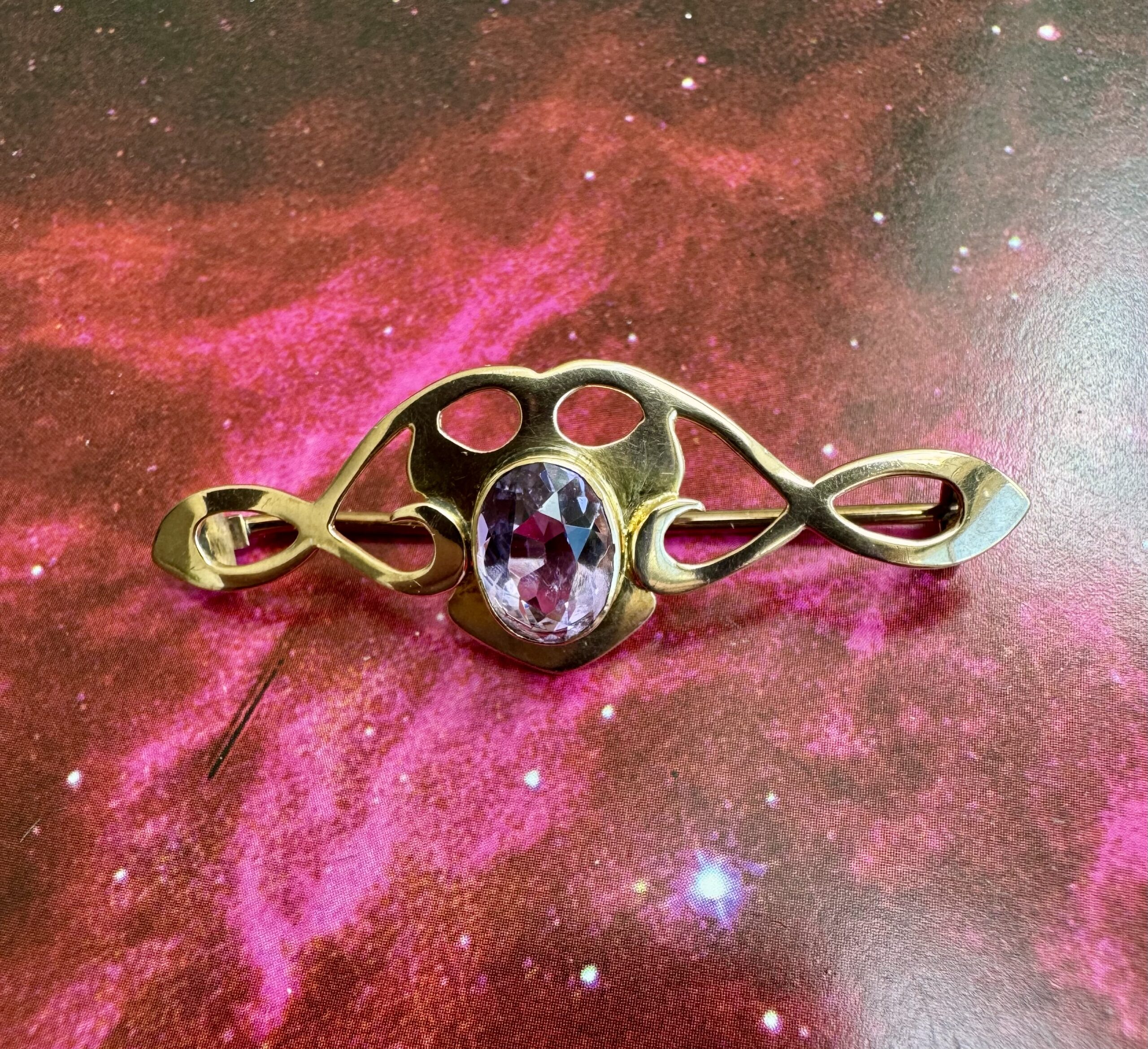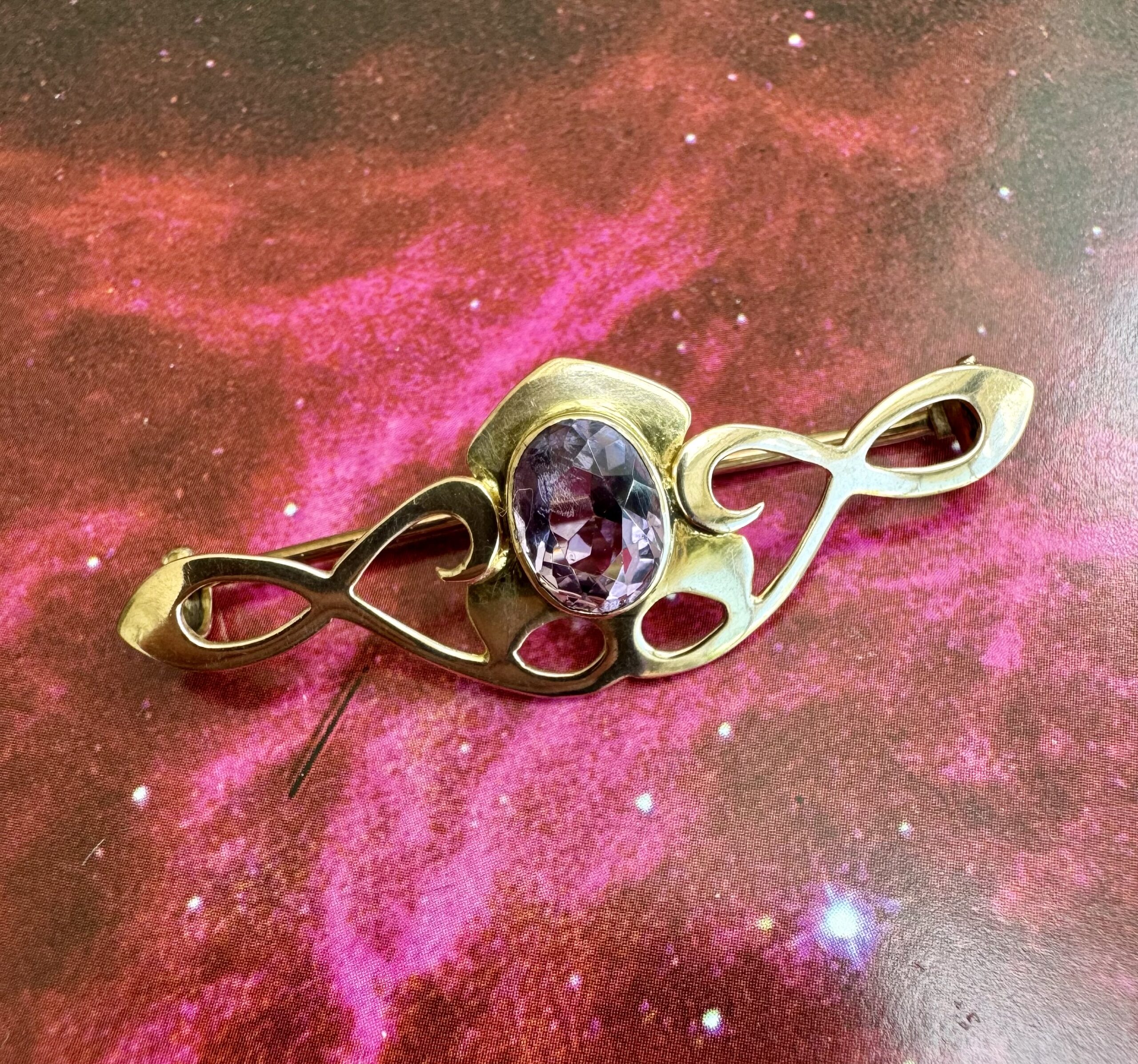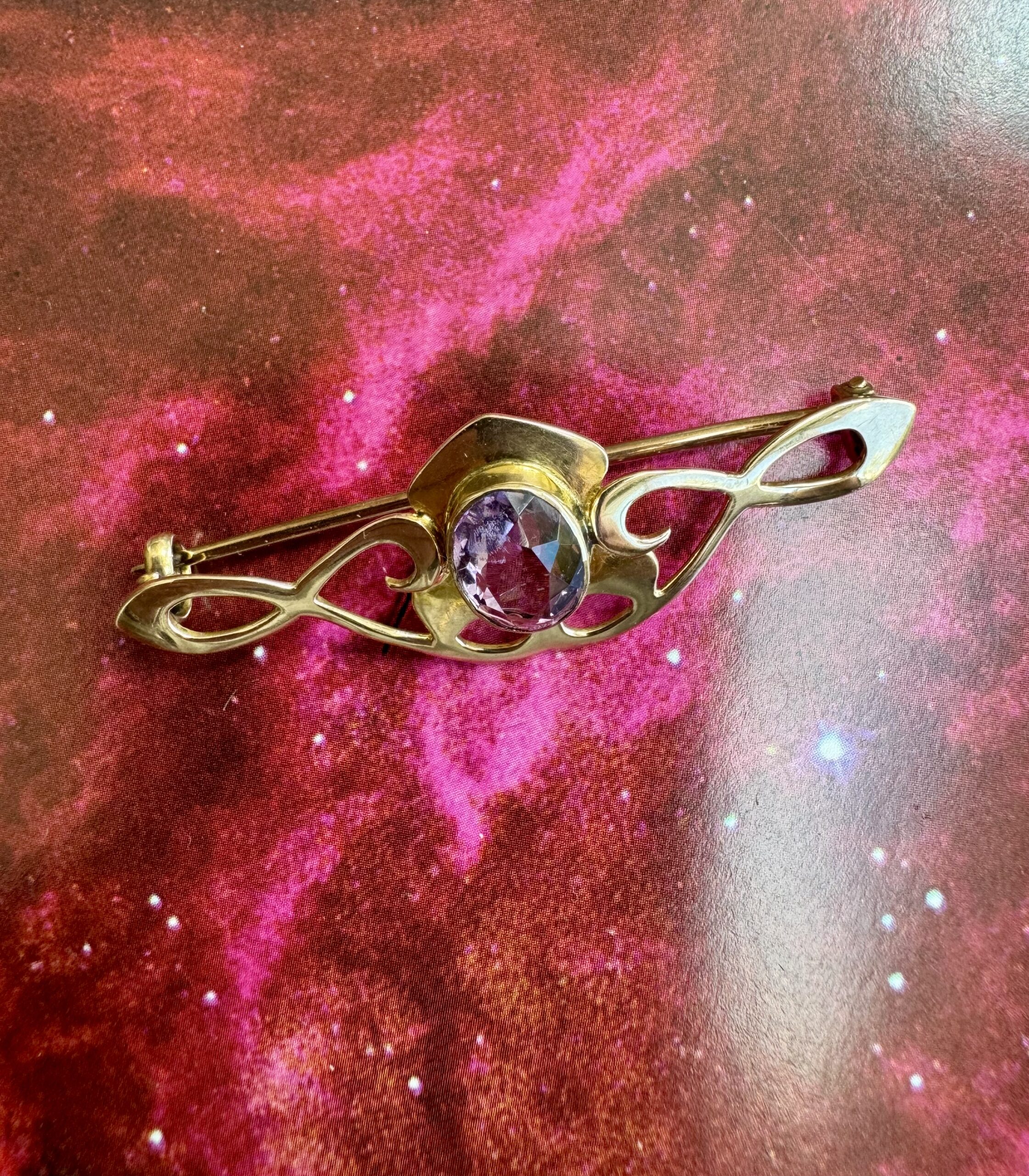 Lovely Art Nouveau 9ct Gold and Amethyst Brooch – beautiful condition, clear stone.