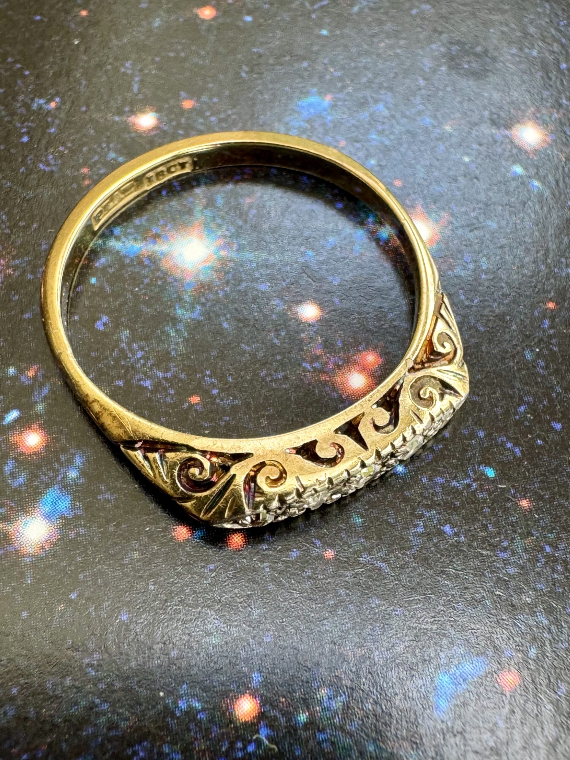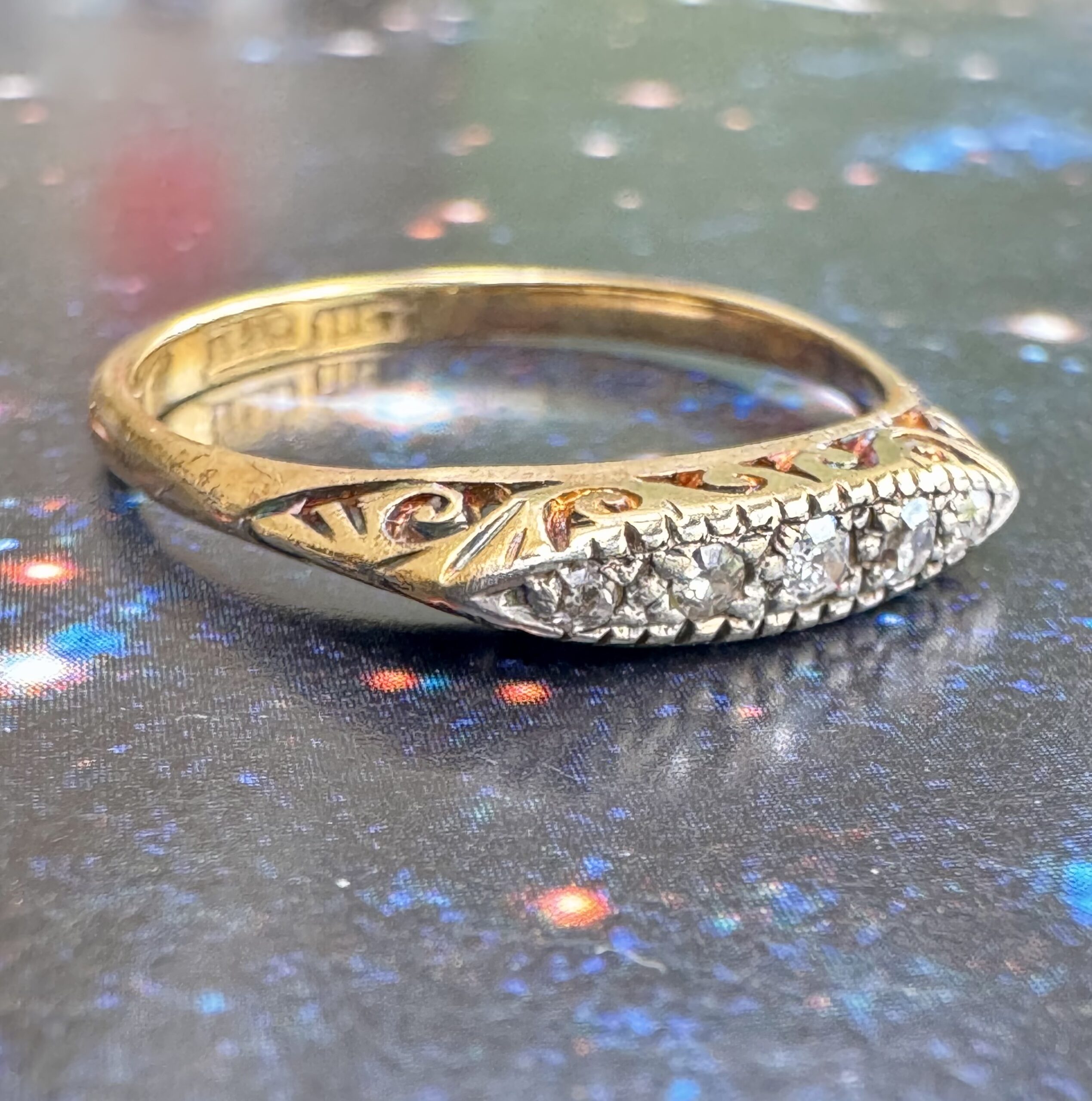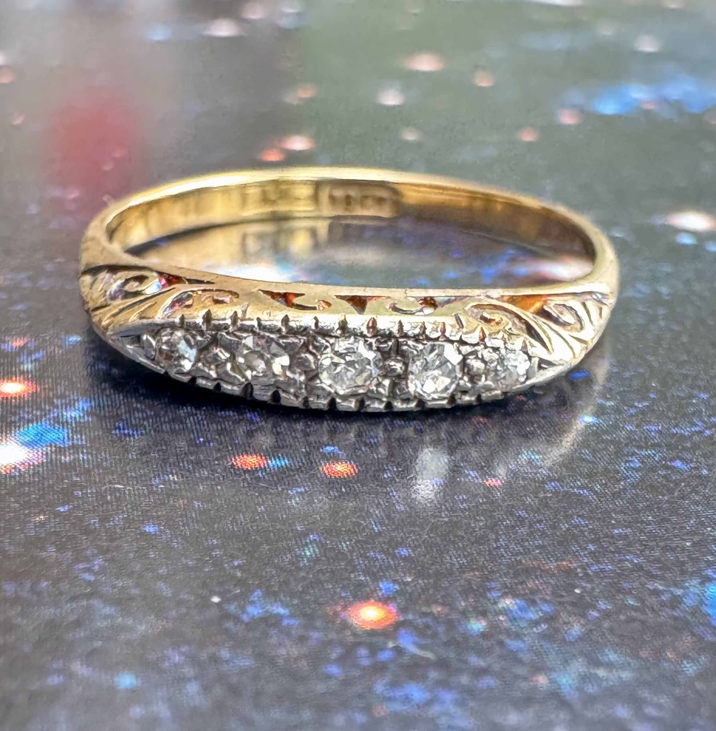 Lovely example of a Victorian 5 stone diamond ring set within a carved gallery. This ring is crafted in 18ct gold and platinum and houses five bright and lively diamonds.