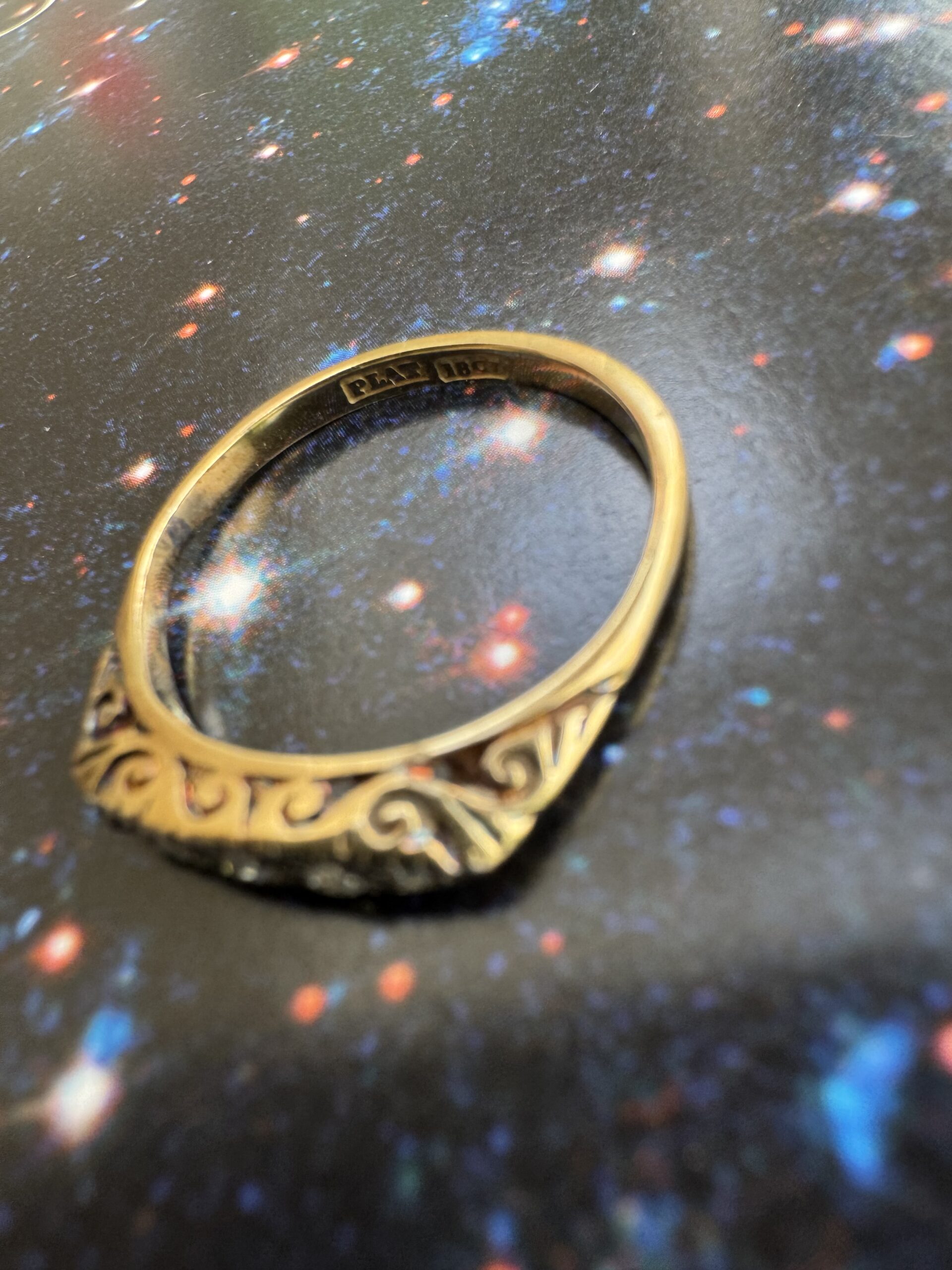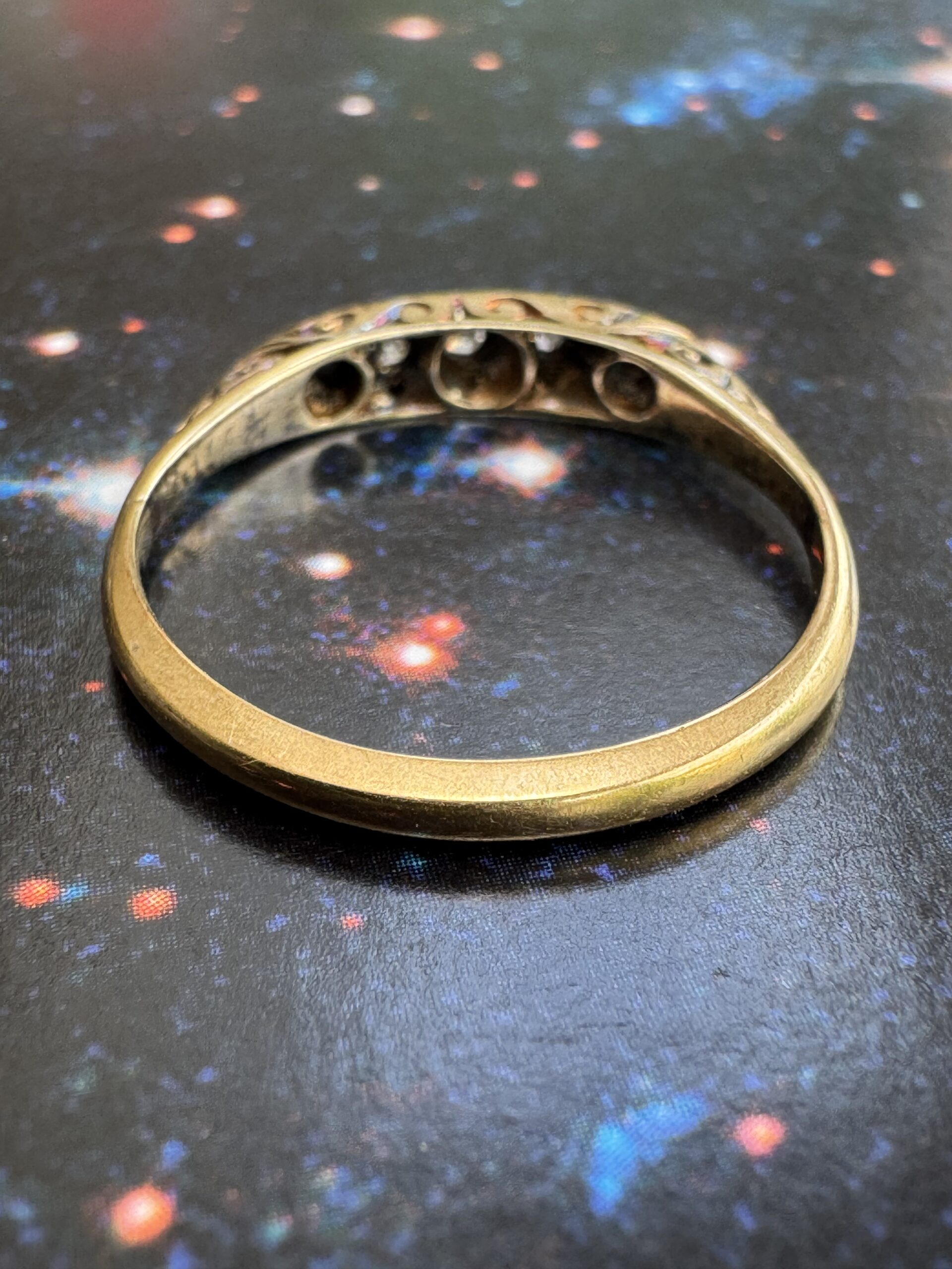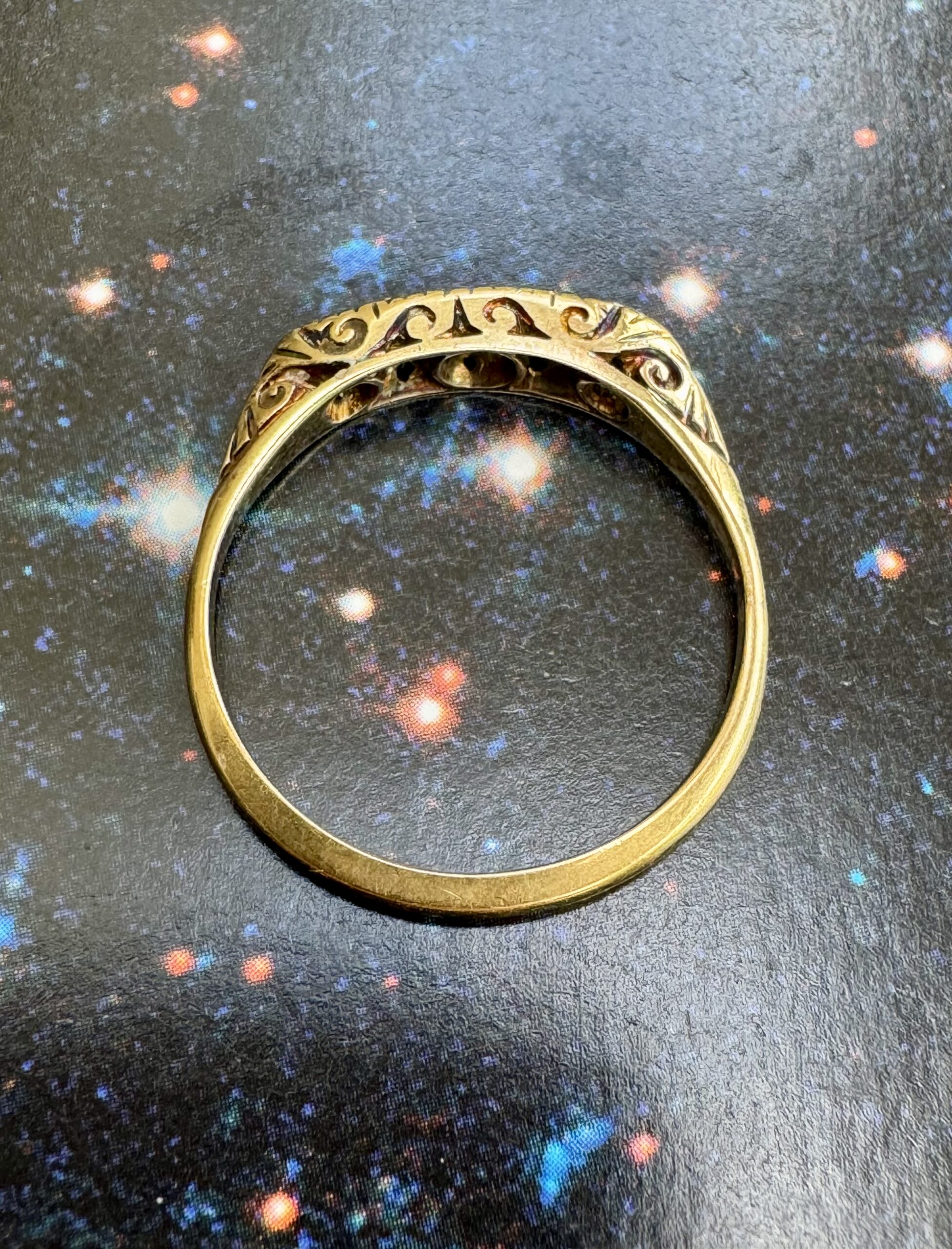 Lovely example of a Victorian 5 stone diamond ring set within a carved gallery. This ring is crafted in 18ct gold and platinum and houses five bright and lively diamonds.