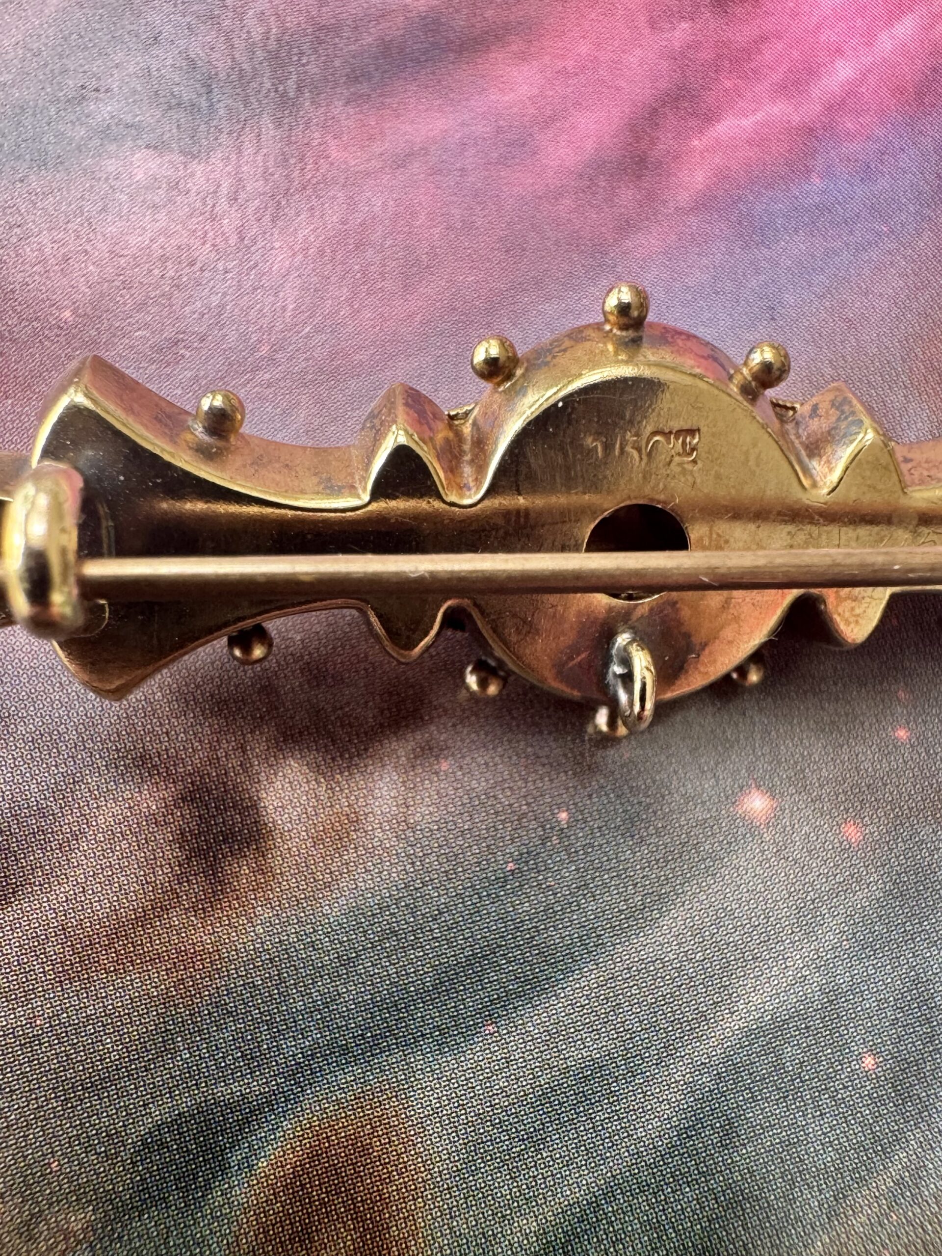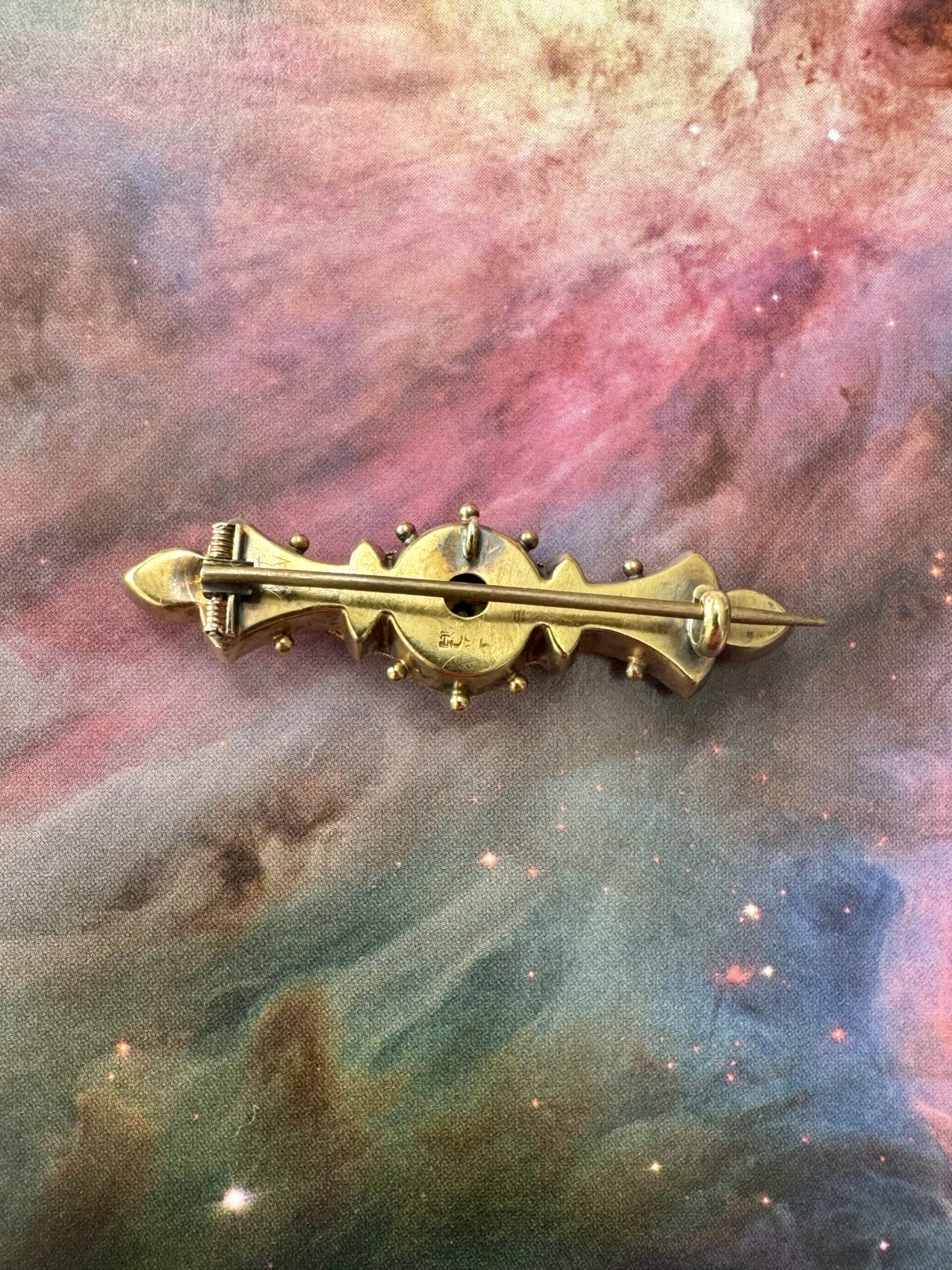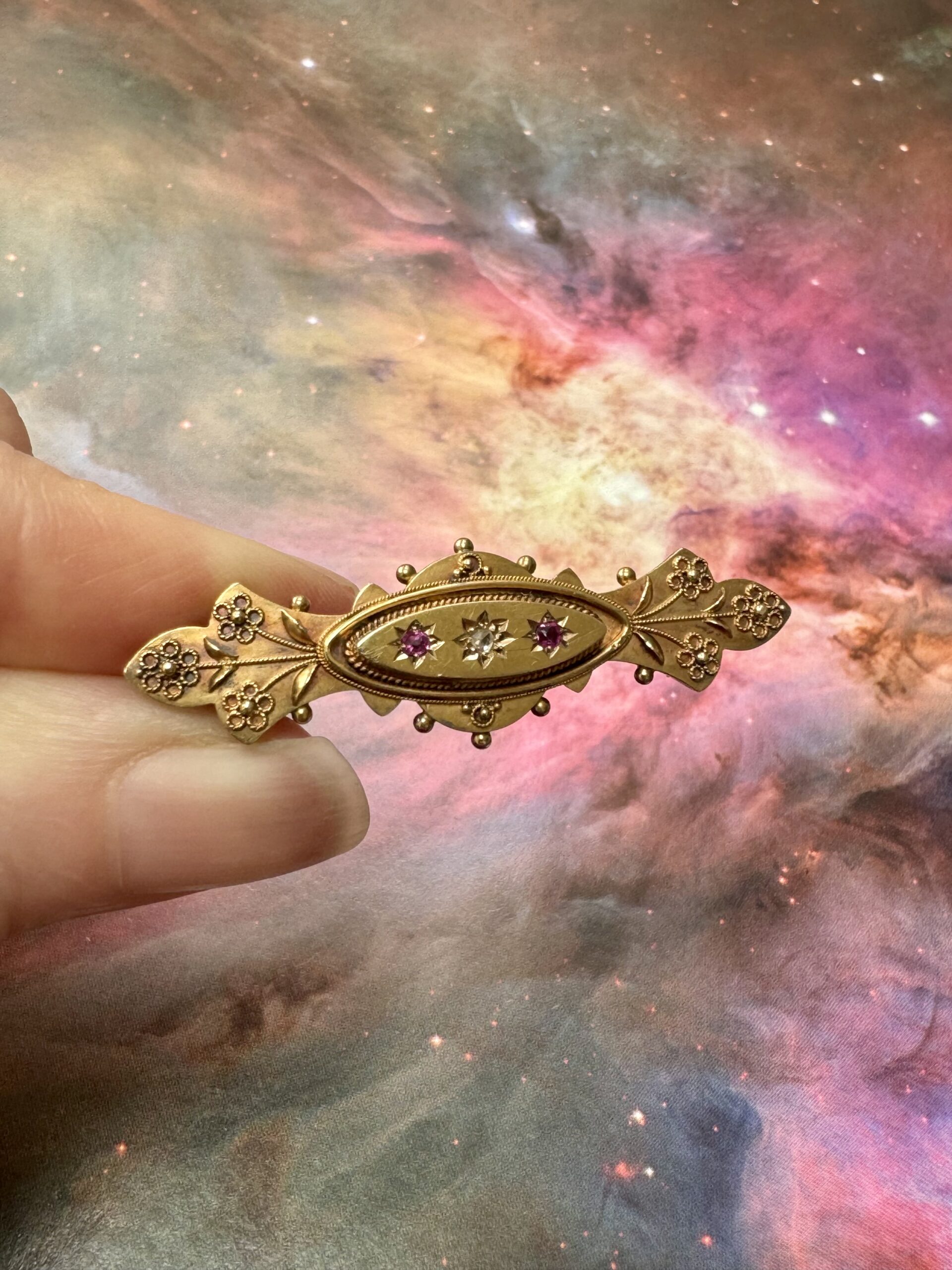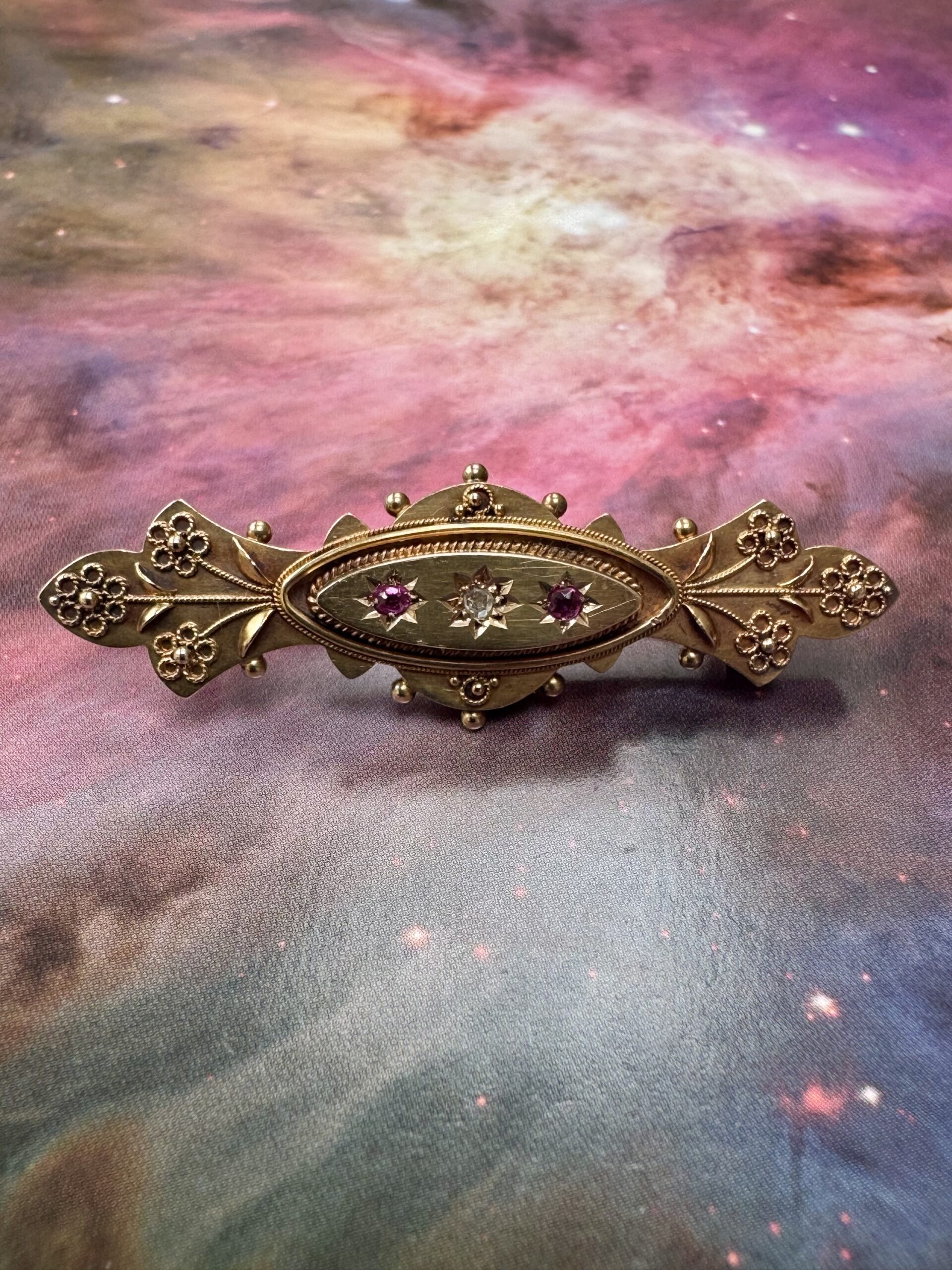 Beautiful Victorian Etruscan revival bar brooch with star-set diamond and ruby highlights with floral wirework detail. Stamped for 15ct gold to the back and tested to confirm.