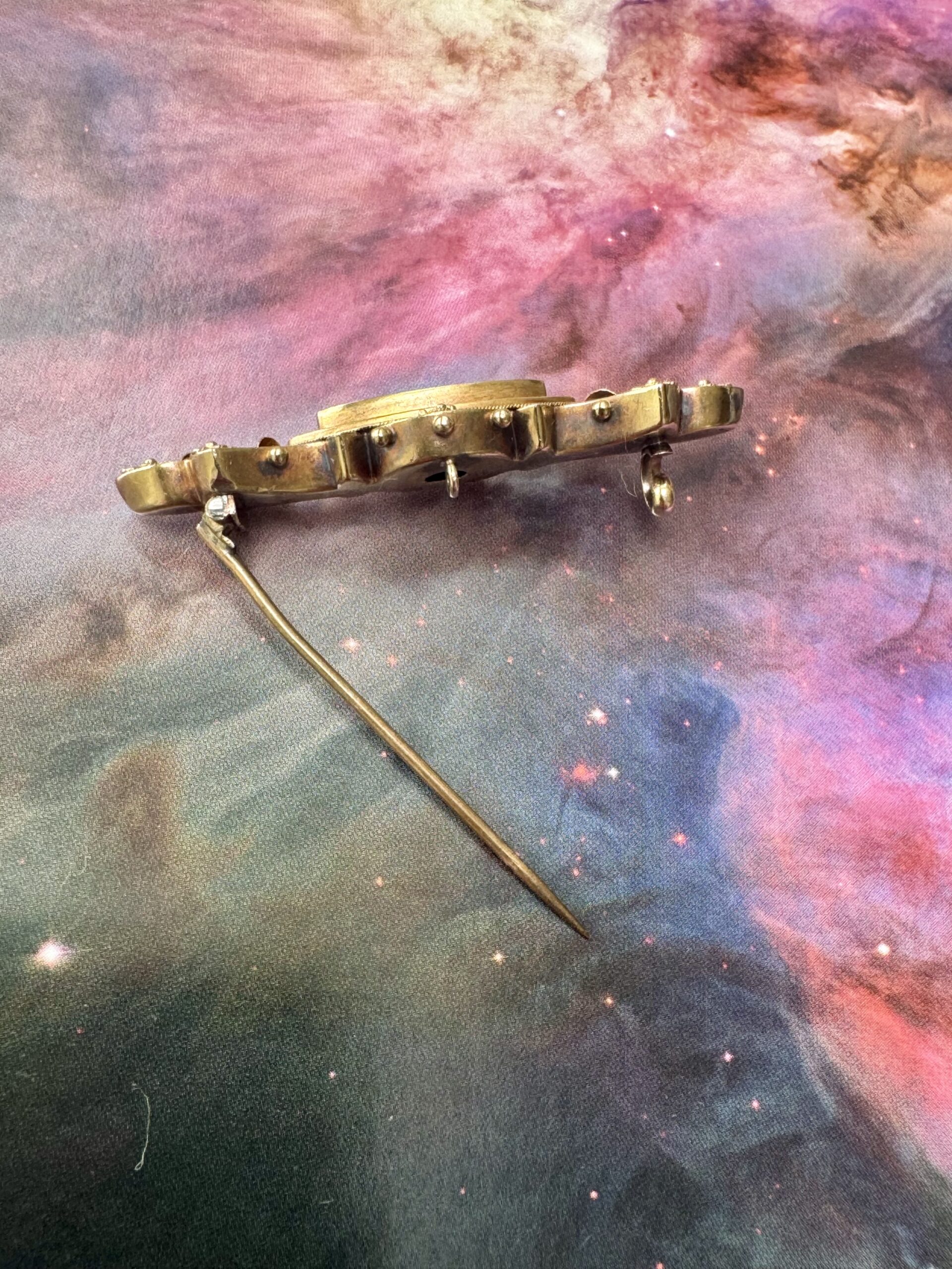 In wonderful antique condition, detail sharp, there are a few light scratches to central panel and a little kink to the pin.