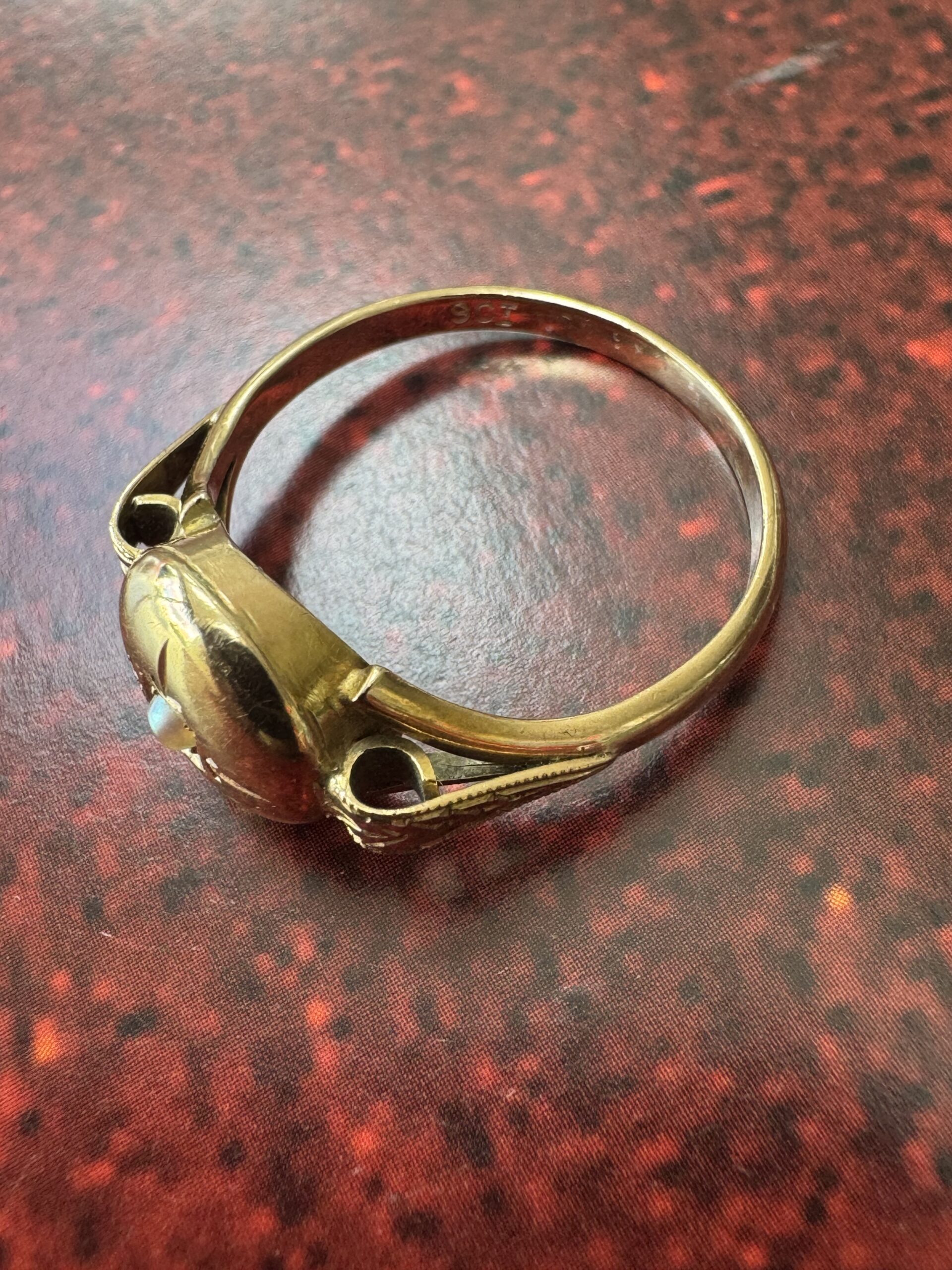 The conversion has been done well and looks like it was done many years ago as the band is simply marked 9ct. The 15ct mark is also present to the back of the decorative head.