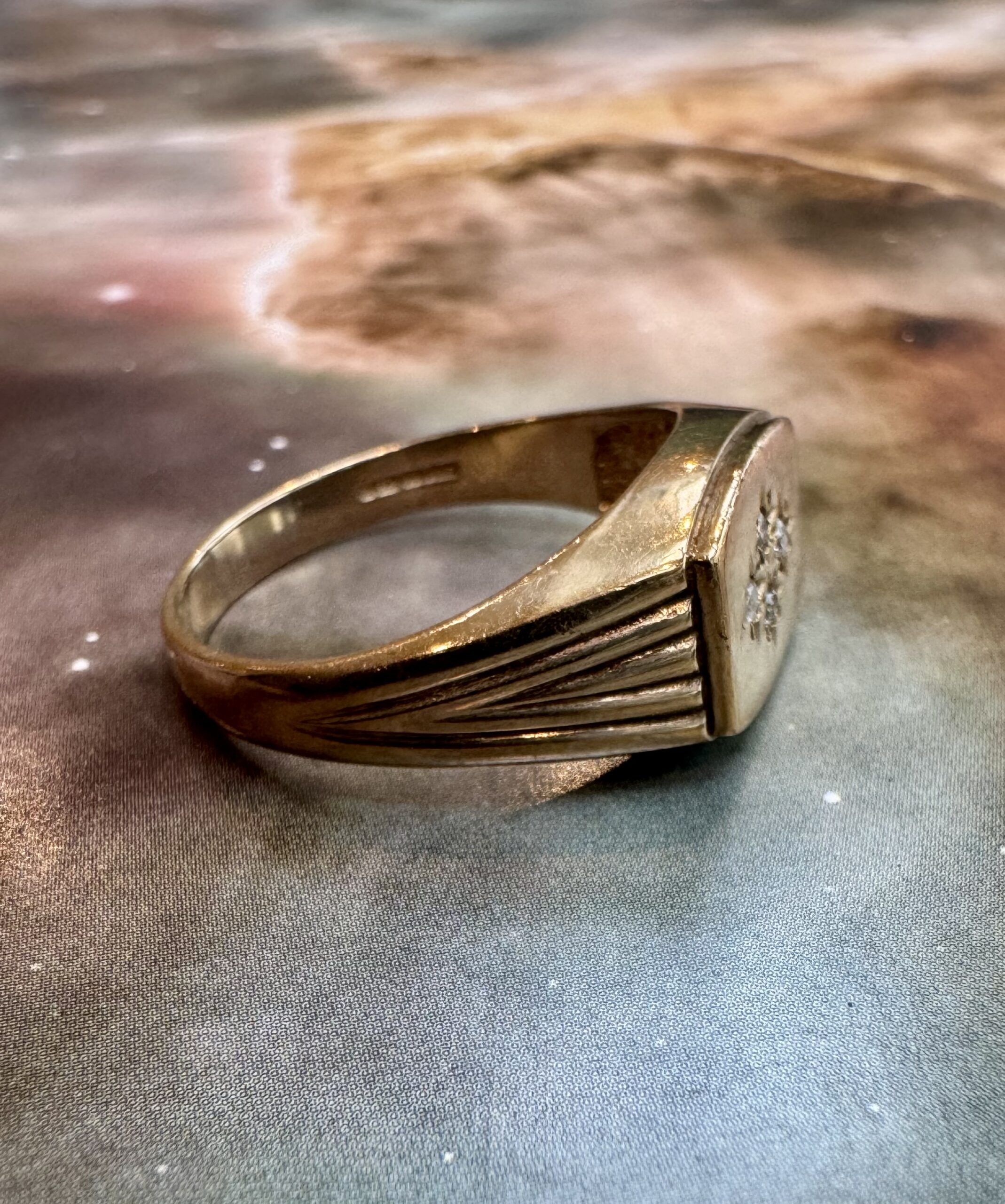 A fabulously chunky and pleasing vintage 9ct gold star set diamond signet ring, with reeded shoulders. Fully hallmarked for 9ct gold/375, assayed in Birmingham, UK.