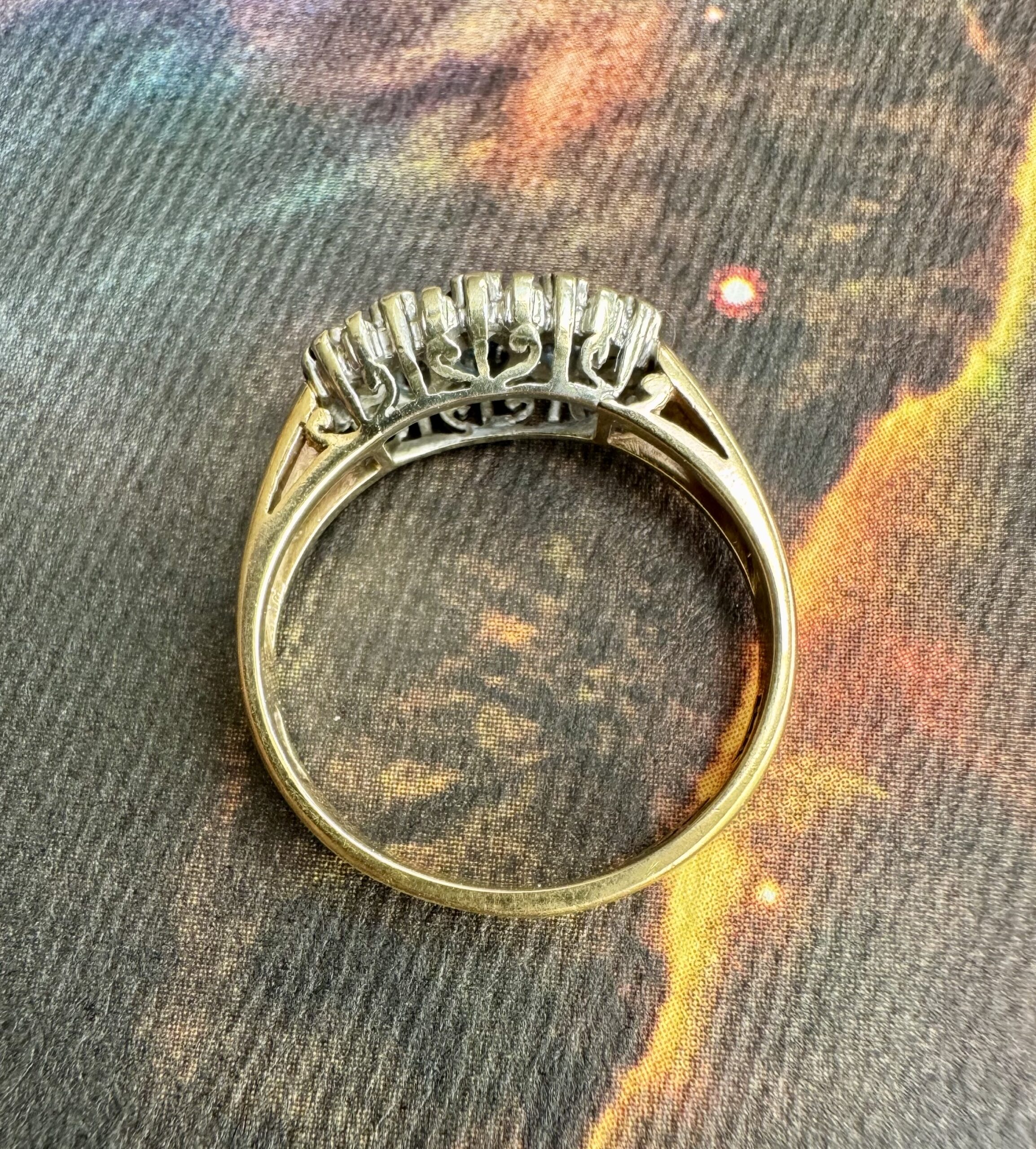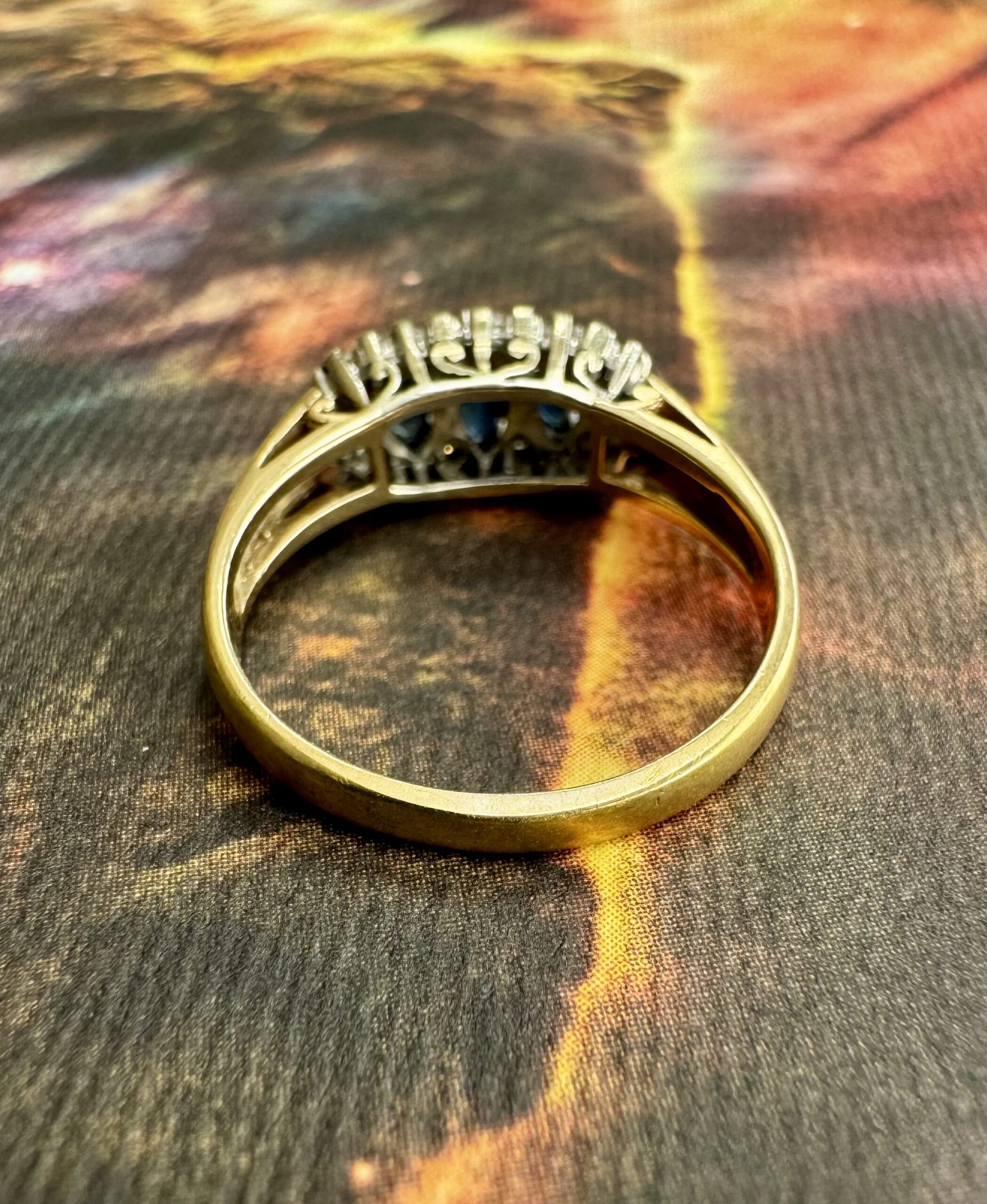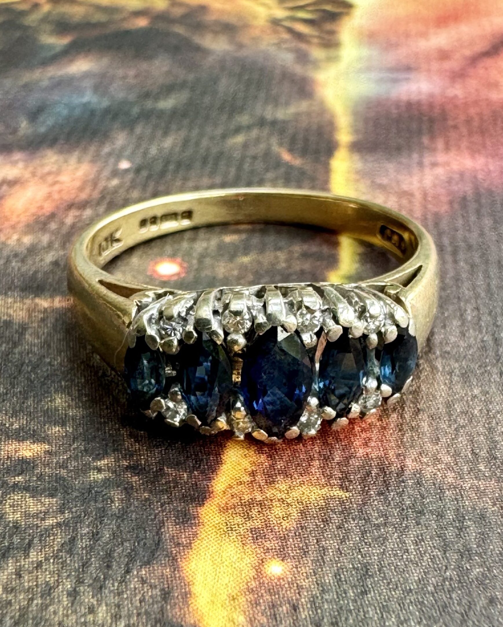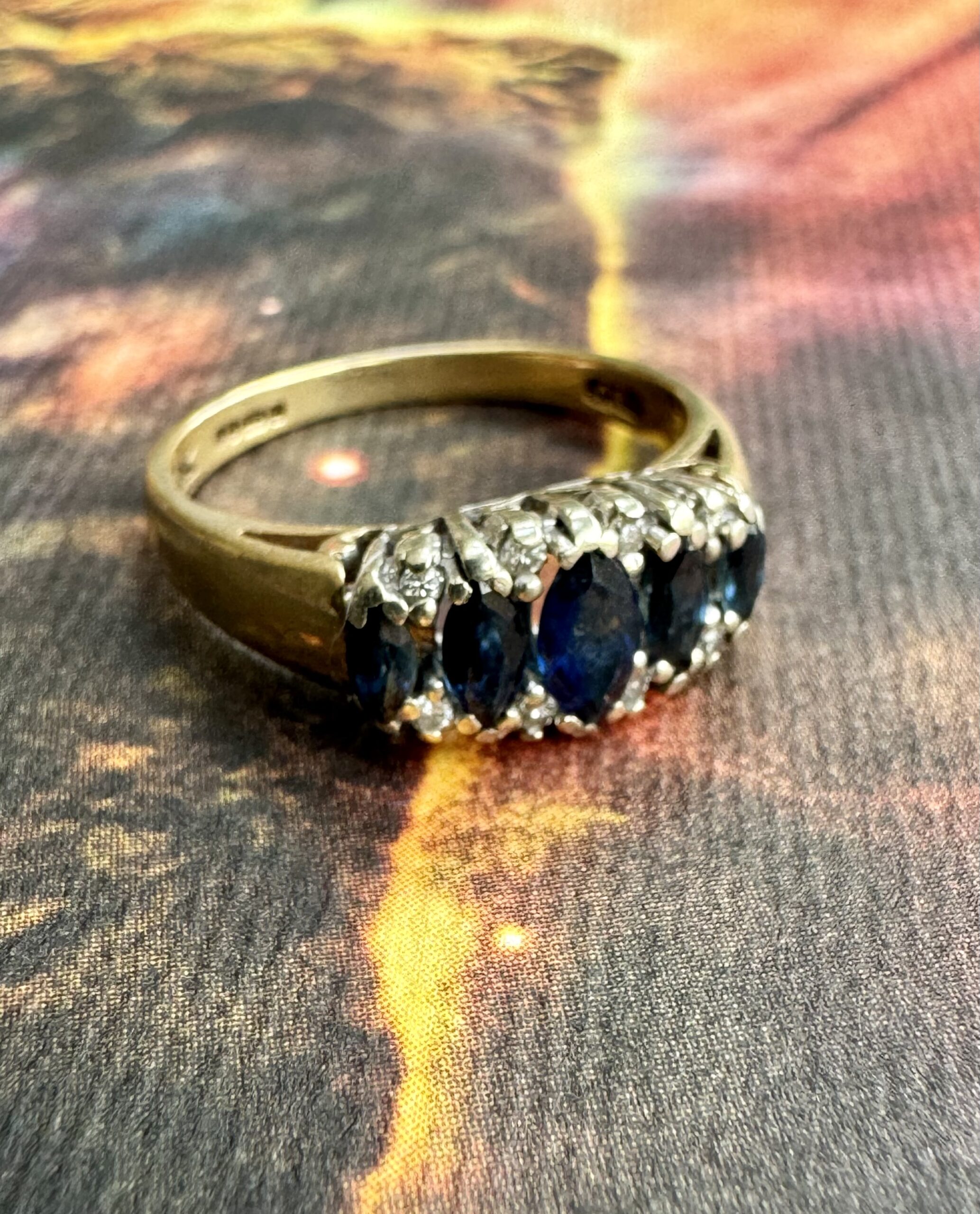 Lovely vintage sapphire and diamond ring in 9ct gold setting with scroll work. The sapphires are marquise cut, well matched and have good colour saturation.
