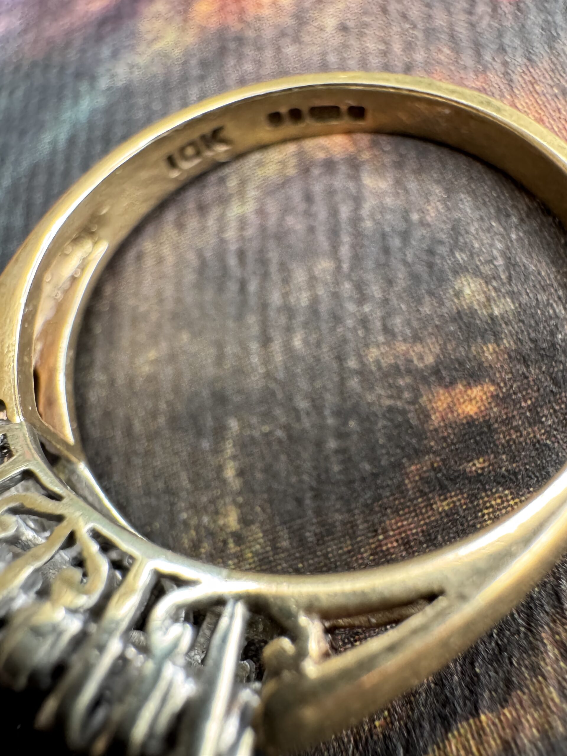 This ring is fully hallmarked for 9ct gold and also 10k, it bears the London assay mark and has a date stamp for 1989.